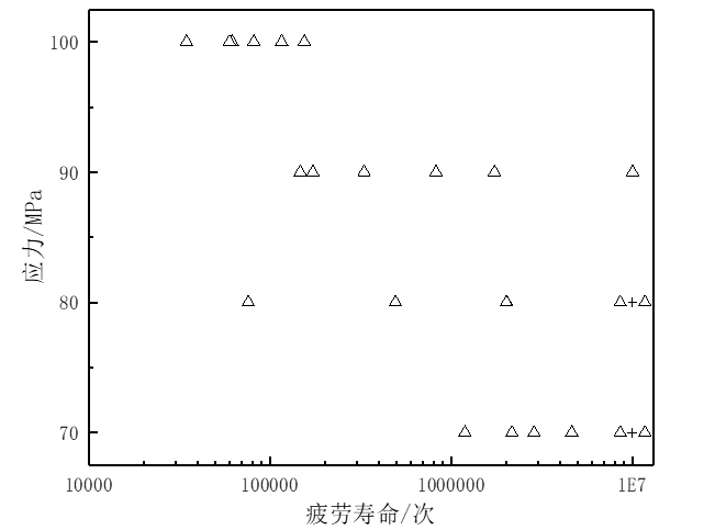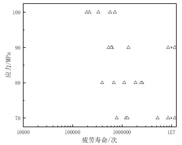 圖3:半固態壓鑄試樣疲勞試驗結果 液態和半固態壓鑄試樣的疲勞試驗結果如圖2和圖3??梢钥闯鰞山M數據在每個應力級上均有較大的離散度。但對比可以明顯看出總體上半固態壓鑄試樣的離散程度明顯小于液態壓鑄試樣。液態壓鑄試樣的疲勞壽命在80 MPa和90 MPa應力級上呈現了極大的離散度。在100 MPa應力級上,可以明顯看出液態壓鑄試樣的疲勞壽命在100 000次附近明顯低于半固態壓鑄試樣的400 000次。在其他應力級對比不明顯的情況下,這能夠在一定程度上反映出半固態壓鑄試樣的疲勞強度優于液態壓鑄試樣。