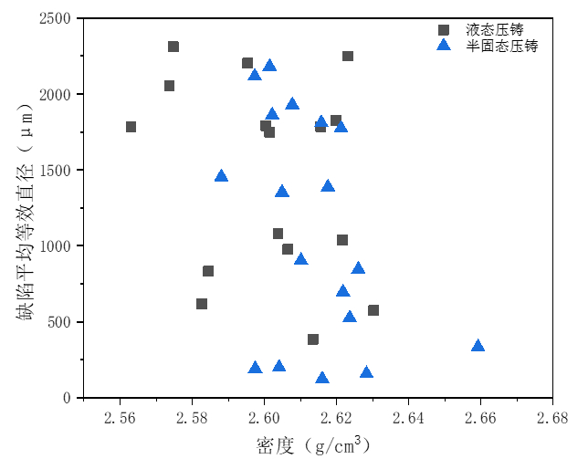 圖4:疲勞試樣密度與裂紋源缺陷平均等效直徑的關系 兩批試樣的密度與裂紋源缺陷尺寸的關系見圖4。液態壓鑄試樣的平均密度為2.598 g/cm³,半固態壓鑄試樣的平均密度為2.616 g/cm³??梢钥闯鲆簯B壓鑄試樣的密度相較于半固態壓鑄試樣更為離散,液態壓鑄試樣的密度區間為2.563 ~2.631g/cm³,半固態壓鑄試樣的密度區間為2.588 ~2.659 g/cm³。兩批試樣的裂紋源缺陷平均等效直徑均有較大波動,但半固態壓鑄試樣的總體偏低。 2.2 鋁合金ZL114A壓鑄件密度對疲勞性能的影響