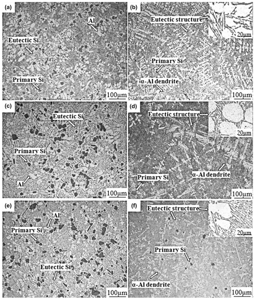 圖5:不同擠壓鑄造壓力下的溫度與壓力變化曲線(TC1和TC2為鑄件溫度,TM1和TM2為模具溫度) 元鵬等發(fā)現(xiàn)隨著澆注溫度降低,Al-7Si-0.4Mg-0.3Er擠壓鑄造件組織中粗大樹枝狀α-Al晶粒轉(zhuǎn)變?yōu)榍驙睿毿“l(fā)達樹枝晶數(shù)量減少,但晶間Er-π-AlFeMgSi相增多。此外,提高擠壓速度也可減小粗大樹枝狀α-Al晶粒尺寸,提高晶界處Er-π-AlFeMgSi相分布的均勻性。舒櫻等研究發(fā)現(xiàn),通過控制模具溫度可實現(xiàn)鑄件順序凝固,提高擠壓鑄造Al-9Si-1.8Cu-1Mn-0.12Ti合金的力學(xué)性能。通過T6熱處理后,擠壓鑄造Al-9Si-1.8Cu-1Mn-0.12Ti合金的屈服強度、抗拉強度和伸長率分別高達282 MPa、388 MPa和8%。姜博等發(fā)現(xiàn),隨著固溶時間增加,擠壓鑄造ADC12合金中粗大片狀共晶硅和針狀A(yù)l5FeSi相可細化為顆粒狀,斷裂形式由準解理斷裂向韌性斷裂轉(zhuǎn)變,抗拉強度提高(固溶10 h時,抗拉強度可達274 MPa)。 除了擠壓鑄造工藝參數(shù)優(yōu)化,合金化及孕育變質(zhì)能夠細化擠壓鑄造鋁硅系合金組織,提高其力學(xué)性能。徐松等發(fā)現(xiàn),在一定范圍內(nèi)添加鎂元素,可細化共晶硅,進而提高Al-10Si-2.5Cu合金的力學(xué)性能。T6熱處理后,Al-10Si-2.5Cu-1.5Mg合金的抗拉強度達到305 MPa。JIANG B等發(fā)現(xiàn),加入Mg-15La能夠促使擠壓鑄造Al-11Si-2.5Cu-0.8Fe合金高溫熔體中形成亞穩(wěn)態(tài)的富La相納米顆粒,可作為共晶硅的有效異質(zhì)形核點,細化共晶組織。T6熱處理后屈服強度、抗拉強度和伸長率分別高達262 MPa、350 MPa和5.5%。 相較于液態(tài)擠壓鑄造,半固態(tài)擠壓鑄造工藝的澆注溫度低,固液相濃度差小,不易發(fā)生偏析。WANG S等采用近液相擠壓鑄造技術(shù)制備ADC12(Al-10.56Si-1.91Cu-0.85Fe-0.55Zn)合金,發(fā)現(xiàn)沿鑄件壁厚方向共晶相的體積分數(shù)降低而α-Al相體積分數(shù)升高。GUAN R G等通過半固態(tài)擠壓鑄造制備A356合金(Al-7Si-0.43Mg-0.19Fe),發(fā)現(xiàn)其可以細化晶粒,消除液態(tài)擠壓鑄造組織中常發(fā)生的共晶相偏析和局部偏析。半固態(tài)擠壓鑄造A356合金的抗拉強度和伸長率分別達到232 MPa和約7%,比傳統(tǒng)擠壓鑄造合金分別提高了12%和21%。 研究表明,將擠壓鑄造和其他工藝有效結(jié)合可減少鑄造缺陷,提高鑄件質(zhì)量和力學(xué)性能。AJAY KUMAR P等[43]利用攪拌摩擦工藝將石墨烯納米片摻入A356合金基體中可顯著改善其力學(xué)性能。擠壓鑄造鋁基復(fù)合材料的屈服強度、抗拉強度和伸長率分別高達190 MPa、357 MPa和12%。熊禹等[44]利用擠壓鑄造和鍛造結(jié)合的方式制備ADC12合金,鑄鍛復(fù)合后晶粒尺寸進一步細化,合金抗拉強度和伸長率達分別為287.75 MPa和4.4%,較普通擠壓鑄造ADC12合金分別提高19.8%和340%。 在汽車工業(yè)中,過共晶鋁硅合金(硅含量大于13%)是用于生產(chǎn)活塞、發(fā)動機缸體和缸套的理想材料。常規(guī)鑄造過共晶鋁硅系合金中存在粗大的初生硅相,會降低韌性并嚴重影響其綜合力學(xué)性能。研究表明,擠壓鑄造能明顯改善過共晶Al-xSi合金的顯微組織。LI R等發(fā)現(xiàn),與重力鑄造相比,擠壓鑄造過共晶鋁硅合金中的共晶硅相發(fā)生明顯細化,同時初生硅相的尺寸和數(shù)量減小(見圖6)。此外,隨著硅含量的增加,初生硅相的尺寸和含量增加,α-Al枝晶的占比分數(shù)逐漸降低。 一般認為,在過共晶鋁硅合金中添加鐵元素可以改善其熱穩(wěn)定性。但是,鐵可與鋁和硅結(jié)合形成較粗的板狀或針狀富鐵相,不利于合金的室溫力學(xué)性能。研究表明,改變擠壓鑄造工藝參數(shù)可調(diào)控富鐵相尺寸,如隨著鑄造比壓從100 MPa增加到300 MPa,富鐵的過共晶鋁硅合金中針狀富鐵相的尺寸減小。此外,在合金熔體的凝固過程中采用輔助調(diào)控技術(shù),如超聲波振動技術(shù),可以進一步細化針狀富鐵相。
