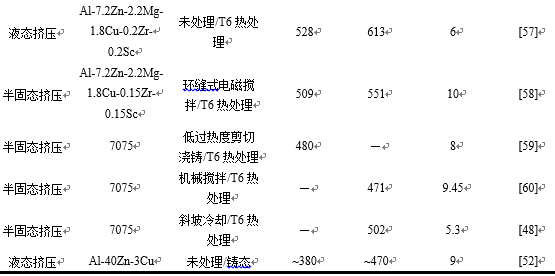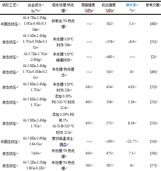 表4:擠壓鑄造鋁鋅系鋁合金力學(xué)性能 3、結(jié)語 航空航天、汽車等領(lǐng)域?qū)Τ叽绺鼮榫堋⑿螤罡訌?fù)雜的大型薄壁鋁合金鑄件的需求推動了新型擠壓鑄造技術(shù)的發(fā)展。雖然擠壓鑄造壓力可以促使凝固鑄件與模具緊密接觸,增加鑄件/模具間的傳熱,細化凝固組織,明顯提高鑄件力學(xué)性能。然而,縮孔、縮松等鑄造缺陷仍無法避免。因此,要根據(jù)不同零件、材料和設(shè)備,通過數(shù)值模擬和試驗相結(jié)合,系統(tǒng)研究擠壓鑄造充型、凝固過程中的組織和性能演變及調(diào)控機制,優(yōu)化工藝參數(shù),提高擠壓鑄造件質(zhì)量的穩(wěn)定性。為了實現(xiàn)高性能擠壓鑄造鋁合金可控制備,當(dāng)前仍面臨一系列挑戰(zhàn)。 (1)合金成分需進一步優(yōu)化。目前實際應(yīng)用中,主要是使用商業(yè)鑄造鋁合金成分進行擠壓鑄造,并未有專門擠壓鑄造鋁合金成分,需針對擠壓鑄造工藝特點開發(fā)適于擠壓鑄造的新型鋁合金成分。 (2)擠壓鑄造工藝需創(chuàng)新及優(yōu)化。半固態(tài)漿料的質(zhì)量會影響擠壓鑄造充型、液相偏析等,進而影響擠壓鑄造件的力學(xué)性能。所以,高質(zhì)量半固態(tài)漿料制備方法值得深入研究。此外,需探索擠壓鑄造和其他工藝的有效結(jié)合,消除或減弱鑄造缺陷,提高擠壓鑄造件質(zhì)量和力學(xué)性能,實現(xiàn)新型擠壓鑄造工藝穩(wěn)定生產(chǎn)以及規(guī)模化應(yīng)用。 (3)建立擠壓鑄造合金成分-工藝-組織-性能關(guān)系。對擠壓鑄造鋁合金成分、制備工藝、組織及性能進行全流程研究,實現(xiàn)高性能擠壓鑄造鋁合金的可控制備。