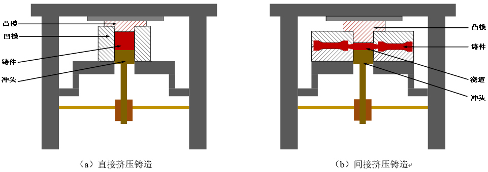 表1:采用擠壓鑄造工藝制備的合金部件 擠壓鑄造工藝在機械靜壓力作用下,使金屬熔體發(fā)生充型、高壓結(jié)晶凝固、補縮和少量的塑性變形,是一種兼具鑄造和鍛造特點的短流程、高效、近凈成形技術(shù)。擠壓鑄造壓力可提高金屬熔體充型、補縮能力,對合金的鑄造性能要求較低,選材范圍廣,適用于大部分鑄造和變形合金。表1為可采用擠壓鑄造工藝生產(chǎn)制備的合金種類及部件。由于擠壓鑄造的高壓力可以提高冷卻速度、細化晶粒,獲得致密組織,減弱合金各向異性,因此擠壓鑄造零部件的力學(xué)性能較傳統(tǒng)鑄件可得到顯著改善。由此可見,擠壓鑄造是航空航天、汽車等領(lǐng)域關(guān)鍵零部件實現(xiàn)輕量化和高性能目標的重要技術(shù)手段之一。吉澤升等總結(jié)了擠壓鑄造工藝在汽車產(chǎn)業(yè)的應(yīng)用現(xiàn)狀,并列舉了擠壓鑄造在汽車輕量化方面應(yīng)用實例。 1、擠壓鑄造工藝 依據(jù)擠壓鑄造過程中所施加壓力的作用方式,擠壓鑄造工藝可分為直接擠壓鑄造和間接擠壓鑄造兩大類,見圖1。直接擠壓鑄造類似于鍛造工藝,擠壓力直接作用在金屬液上,一般適于形狀不太復(fù)雜的厚壁鑄件。間接擠壓鑄造是在擠壓沖頭的作用下使金屬液通過澆道充型。間接擠壓鑄造工藝大致與壓鑄工藝接近,但其擠壓力較大、充型速度相對較小。