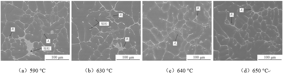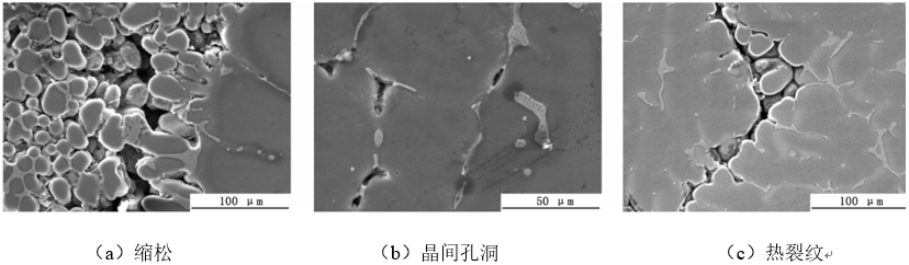 圖2:不同施壓熔體溫度下Al-5.0Cu-0.6Mn-0.5Fe合金的SEM組織 然而,擠壓鑄造鋁銅系合金依然會出現(xiàn)縮松、熱裂紋等鑄造缺陷。在比壓為50 MP、澆注溫度為730 °C和模具溫度為250 °C時,擠壓鑄造Al-5Cu-0.4Mn合金會出現(xiàn)縮松、裂紋等鑄造缺陷(見圖3)。研究表明,在合適的澆鑄和模具溫度下,通過增大擠壓力的方法可獲得致密且尺寸較細的顯微組織,以減少縮孔、縮松及降低熱裂傾向。此外,對于鋁銅合金來說,擠壓鑄造可以和熱處理工藝結(jié)合,進一步提高合金的力學(xué)性能。SARFRAZ S等將擠壓鑄造Al-3.5Cu合金進行原位熱處理,發(fā)現(xiàn)合金的抗拉強度和伸長率比鑄態(tài)合金明顯提高,從261.5MPa和7.6%增到284.6MPa和8.7%。LIN B等發(fā)現(xiàn),相較于普通鑄造,擠壓鑄造Al-5.0Cu-0.6Mn-1.0Fe-1.0Ni合金內(nèi)θ析出相增多。同時,合金中有更致密、耐熱的Al9FeNi和Al3CuNi相析出,且β-Fe相和孔隙減少,降低了應(yīng)力集中和微孔或裂紋的形成,使合金的力學(xué)性能提高。表2為部分擠壓鑄造鋁銅合金的力學(xué)性能,擠壓鑄造鋁銅系合金的抗拉強度和伸長率可高達450 MPa和20%以上。
