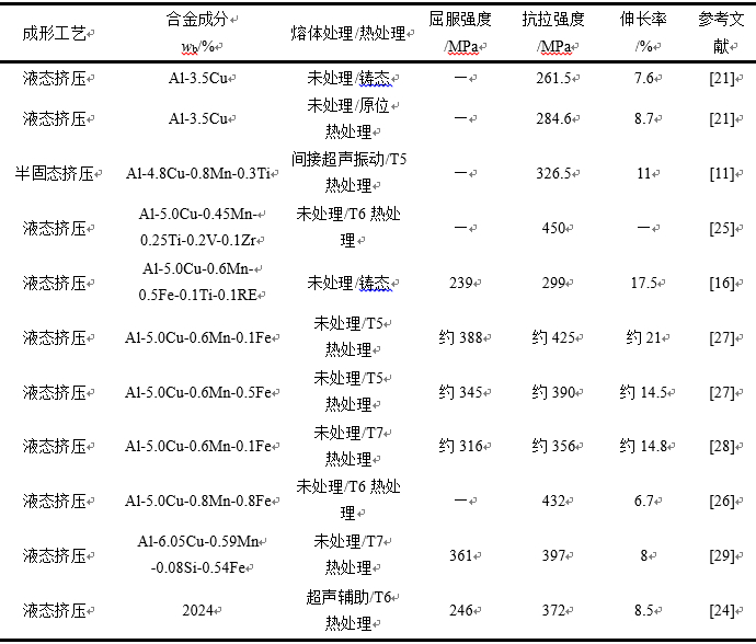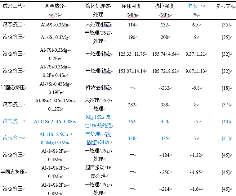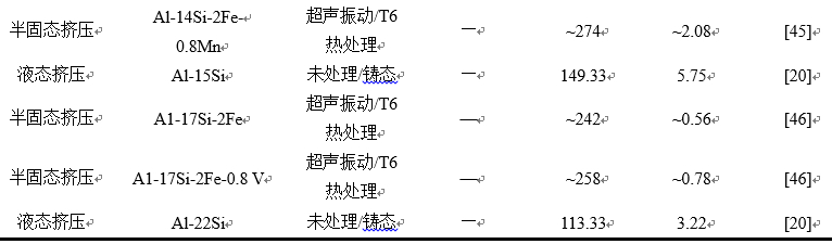 圖4:富鐵金屬間化合物的典型三維形態(tài):(a)0.5%Fe,0 MPa; (b)0.5%Fe,75 MPa; (c)1.0%Fe,0MPa,(d)1.0%Fe,75MPa 2.2 鋁硅系合金 鋁硅系合金膨脹系數(shù)小,具備良好的鑄造流動性和耐磨性,在鑄造鋁合金中用量占比較大。對于亞共晶鋁硅系合金,針狀共晶硅會影響合金的強度和塑性。通過改性共晶硅、細化晶粒和減少鑄造缺陷可以提高鋁硅系合金的力學(xué)性能。表3為部分擠壓鑄造鋁硅合金的力學(xué)性能,擠壓鑄造工藝可明顯提高鋁硅系合金的力學(xué)性能,其抗拉強度最高可達430 MPa以上。