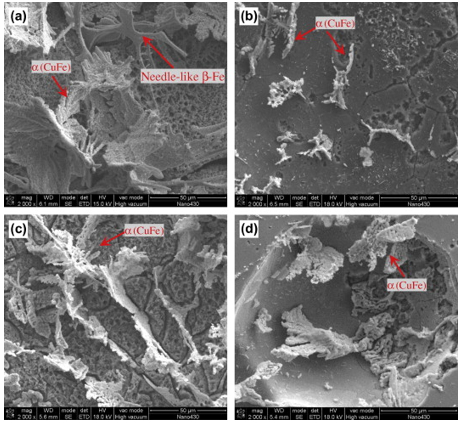表2:擠壓鑄造鋁銅系鋁合金力學(xué)性能 更重要的是,擠壓鑄造可改善鐵等元素對鋁銅系合金性能的危害。LIN B等研究發(fā)現(xiàn),擠壓鑄造可有效減少Al-5.0Cu-0.6Mn-xFe合金內(nèi)富鐵相(尤其是脆性β-Fe相)的析出(見圖4),進而提高合金的力學(xué)性能,且增加了合金的可回收利用率。LIN B等[29]發(fā)現(xiàn),擠壓鑄造Al-6.05Cu-0.59Mn-0.08Si-0.54Fe合金(經(jīng)T7熱處理)的室溫和高溫(300 °C)力學(xué)性能相對于普通鑄造合金(經(jīng)T7熱處理)均有所提升。比壓為75 MPa時,合金抗拉強度、屈服強度和伸長率可高達397 MPa、361 MPa和8%。該優(yōu)異的力學(xué)性能是由于擠壓鑄造可以細化晶粒尺寸和富鐵金屬間化合物,降低孔隙率并提高α-Al基體中的θ相數(shù)密度。但是,高溫下晶粒粗化和晶界弱化導(dǎo)致高溫強度提升不明顯。