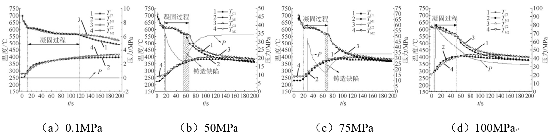 表3:擠壓鑄造鋁硅系鋁合金力學(xué)性能 王春濤等研究了Al-7Si-Mg合金在擠壓鑄造過程中壓力對收縮缺陷形成的影響。圖5為在不同擠壓鑄造壓力下合金凝固過程中溫度與壓力的變化曲線,P為合金凝固過程中的底部壓力。凝固結(jié)束前,50 MPa鑄造比壓難以使鑄件的凝殼繼續(xù)變形,對內(nèi)部糊狀區(qū)的補縮作用減弱,因而在底部壓力達到極小值后的凝固階段容易產(chǎn)生收縮缺陷。鑄造比壓增大到75 MPa,凝殼達到臨界尺寸的時間推遲,鑄件易產(chǎn)生缺陷的時間區(qū)間變窄,而在100 MPa的鑄造比壓下,凝殼可以持續(xù)發(fā)生變形,實現(xiàn)對內(nèi)部糊狀區(qū)的補縮,消除收縮缺陷。MALEKI A等發(fā)現(xiàn),擠壓鑄造壓力(外壓小于100 MPa)會減小LM13(Al-12.3Si-1.3Cu-1.2Mg-0.4Fe)合金中α-Al的晶粒尺寸和二次枝晶間距(SDAS),并降低共晶硅顆粒的平均長徑比。ABOU E L的研究表明,增大擠壓鑄造壓力可以獲得組織致密的Al-6Si-0.3Mg合金。在鑄造比壓為160 MPa的條件下,合金屈服強度、抗拉強度和伸長率分別達到114、132 MPa和6.5%。而且,與普通鑄造合金相比,合金達到峰值時效所需的時間減少,其屈服強度、抗拉強度和伸長率均明顯提高,分別達到190 MPa、208 MPa和8%。