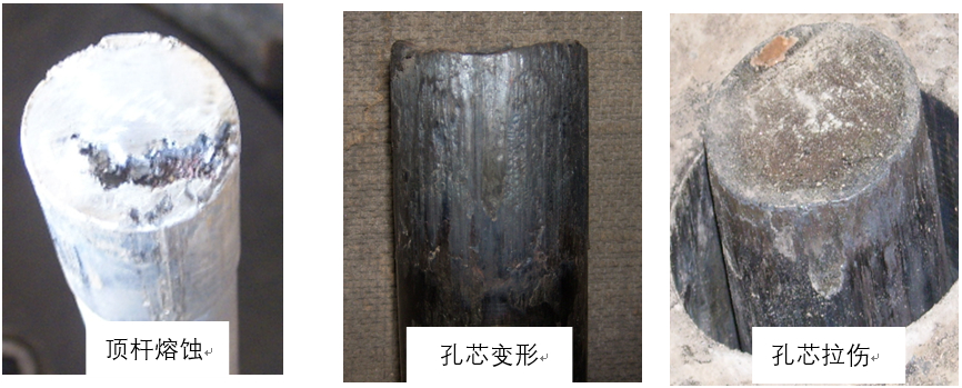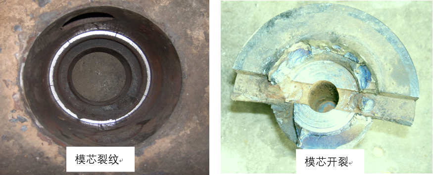 由式(1)和式(2)可見,降低模具成本占比的技術途徑有3個:一是提高各個模具消耗件的壽命Ni,二是提高單模產量W,三是降低模具消耗件自身的成本Ci。其中,提高模具消耗件壽命來降低模具成本占比受到了普遍重視,但是,在工件和模具材料確定的情況下,消耗件的壽命提高潛力很困難,提高單模產量W和降低模具消耗件自身成本Ci是降低模具成本占比的最有效的途徑。由此,可以認為,工件單重越大,模具成本占比反而越低。也就是說,大型工件擠壓鑄造的模具成本占比反而小于小型零件。 1.2 模具的失效形式 模具消耗件壽命與其失效形式直接相關。模具消耗件的失效形式主要是兩類:①孔芯、頂桿、活塊、壓頭等運動件的變形、斷裂,見圖2;②模芯(也稱模仁)等賦形零件的變形、龜裂、熔焊和拉傷,見圖3和圖4。雖然各消耗件具體的時效形式有很大差異,但其失效的首要根源就是高溫金屬液的熱作用和高壓的力學作用。孔芯、頂桿、活塊、壓頭等的變形主要是因為包裹其的金屬液向其傳熱導致溫升過大,一旦超過其再結晶溫度,就會在抽芯、脫芯等過程被拉伸變形;賦形零件模芯的開裂主要發生在模具使用初期,高溫鋼水的熱沖擊作用,使其內部熱應力過大,超過了材料的極限強度而斷裂;局部熔焊則是發生在高溫金屬液直接長期沖擊的位置,高溫金屬液的熱量急速在此處積累,使模具局部溫度快速升高,一旦超過了材料的固相線溫度,就會出現局部熔化,隨后凝固過程與工件熔焊在一起。