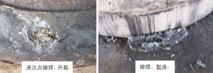 圖4:熔焊或黏連失效 1.3 降低模具費用占比的技術途徑 雖然模具失效的機理清晰,但要控制其失效、提高壽命,需要從模具材料、制造工藝、使用維護等多方面綜合治理,但以減低模具成本占比為目標,問題則相對簡單。一般來說,模芯的壽命是所有模具消耗件中壽命最長的,其自身成本也最高。因此,提高模芯壽命、降低模芯自身成本是降低模具成本占比的關鍵。 1.3.1 使用鑄造模具 模具消耗件的壽命首先取決于其材料自身,因此,在小型工件擠壓鑄造中,使用高溫合金、高級熱作模具鋼等模塊材料制作模具消耗件,可以明顯提高使用壽命,也能使模具費占比有所下降。但是,在大型結構件擠壓鑄造中,消耗件尺寸大,若使用高級模具鋼鍛造模塊材料制造模芯,因材料利用率低導致自身制造成本很高,雖然提高了壽命,但并不能使模具費用占比下降,有時甚至有所提高。相反,若使用鑄造模具鋼制造模芯,雖然使用壽命不及鍛造模具鋼,但其材料及制造成本顯著下降,進而使模具成本占比降低。粗略估計,使用鑄造模芯可以減少材料用量50%左右,加工費用減少40%左右,所以鑄造模芯的制造成本可以比鍛造模塊制造模芯降低至少60%。 由于鑄造模芯材料的熱強性較低,可以配合使用隔熱/絕熱雙層涂料,使模具最高工作溫度顯著降低,能有效防止開裂、熔焊和變形,達到提高使用壽命、降低模具成本占比的目的。 1.3.2 模具溫度的調控 模具溫度調控一直是有模成形領域關注的熱點和難點。對于大型結構件擠壓鑄造來說必須解決,否則擠壓鑄造的工藝優勢很難發揮出來。目前能用于大型結構件擠壓鑄造模具的模溫機尚不成熟,且運行費用較高。可行的模具溫度調控措施如下: (1)使用高導熱耐高溫模芯 回轉體或箱體類大型結構件的擠壓鑄造使用高導熱耐高溫模芯+高強鑄造模套組合模具可以實現模具溫度的有限調節。將水道開在模套上而不是開在模芯上,通過溫度傳感器和伺服閥組成的控制系統,可以實現模具溫度的閉環調控。這樣既可以防止大型模芯使用中變形導致密封破壞出現漏水事故,又可以確保熱量能及時排出。其中高導熱耐高溫模芯的首選材料是高強石墨。石墨的導熱系數是模具鋼的3倍左右,且其熱膨脹系數僅為鋼的1/6,所以,屬于良好的模具材料,其使用壽命可以長達萬模以上。因此,利用石墨做模芯,用帶有內冷水道的鑄鋼做模套,既可以有效實現模具的溫度調控,又可以降低模具成本占比。但是,石墨原料的選擇和拼接是直接影響模具造價的重要方面,需要巧妙設計。 (2)使用導熱體技術調節模具溫度 大型復雜結構件的擠壓鑄造模具還可以局部使用導熱體的方法來調節模具溫度場。所謂導熱體方法就是在需要進行局部精細控制溫度的位置,在其模芯與模套之間嵌裝一個銅或鋁制成的冷卻體,其內鑲鑄冷卻水管,通以水、油或液氮等冷卻介質,并采用控制系統控制其流量達到調控其冷速的目的。在工件壁厚差異很大的特大型鋼鐵件擠壓鑄造中,這種方法尤為適用。 2、大型結構件擠壓鑄造的工藝裝備 大型結構件擠壓鑄造的另一個關鍵問題是其工藝裝備的大型化。按照傳統擠壓鑄造的概念,直徑1 m的輪形件直接加壓擠壓鑄造,比壓取100 MPa,則需要的擠壓力要高達到80000 kN,這是一個巨大的挑戰。因此,要實現大型結構件擠壓鑄造必須重新認識擠壓鑄造,并采用能夠“小馬拉大車”的工藝技術。歸納起來,可以有效降低擠壓鑄造機噸位的技術途徑有局部加壓擠壓鑄造、復合擠壓鑄造和隨流半固態擠壓鑄造。 2.1 局部加壓擠壓鑄造 為了減小或消除擠壓鑄造模具作動件之間的過盈摩擦,降低擠壓鑄造機的噸位,邢書明等發明了多點局部加壓的擠壓鑄造方法,見圖5。這種方法變整體加壓位局部加壓,變直接補縮位間接補縮。回轉體零件擠壓鑄造,不是采用傳統的凹凸模擠壓,而是采用了上下模結構,見圖5,沿圓周設置多個直徑與其壁厚接近的小壓頭,進行局部擠壓,壓頭下方的金屬熔體就會依照最小阻力原理向壓頭周邊流動補縮,這就相當于重力鑄造中的多個冒口補縮。對于圖5的直徑1 m的輪形件,只需要5000 kN左右的擠壓鑄造機就可以使比壓達到100 MPa以上,所得零件致密無縮松。