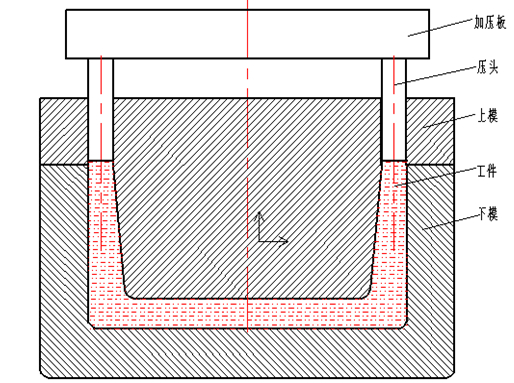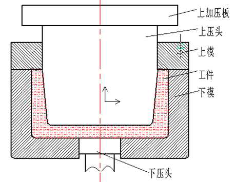 圖5:局部加壓擠壓鑄造示意圖 傳統的擠壓鑄造是對整個工件的整個水平投影面積范圍內進行直接加壓。這在小型工件上是可以的,但是對于大型結構件而言,凸模(或壓頭)的熱膨脹量高達數mm,使凹凸模之間的動作間隙經常處于過盈配合狀態,大量的擠壓力消耗在了克服這種過盈摩擦力上,因而出現了名義比壓高達150 MPa,鋁合金輪轂內部仍然存在縮松缺陷的“奇怪”現象。 相比之下,傳統鑄造技術補縮靠的是大氣壓力作用下冒口內的金屬液流動補縮。補縮壓力很低,只有0.1 MPa。但只要能創造順序凝固,確保補縮通道暢通,就能獲得補縮良好的致密鑄件。類似地,低壓鑄造補縮主要靠的是升液管的澆道補縮,雖然補縮壓力不足0.6 MPa,但是,只要工藝合理,同樣能獲得補縮良好的致密鑄件。這說明,如果能消除凹凸模之間的過盈摩擦,擠壓鑄造的補縮壓力可以大幅降低。通常說的液鍛比壓應當理解為是“名義比壓”,并不是真正作用于金屬熔體的比壓。因為金屬在熔點附近的變形抗力一般都不足1 MPa。因此,要實現良好的補縮,作用在金屬熔體上的比壓只要10 MPa左右就可以了! 2.2 間接-直接復合加壓擠壓鑄造 為了降低大型結構件擠壓鑄造裝備的噸位,還可以利用間接充型、直接擠壓補縮的復合擠壓鑄造方法進行成形。金屬液澆入壓室或型腔內,通過下壓頭對金屬熔體加壓,金屬熔體在這一壓力作用下發生流變,充滿型腔,見圖6,這個過程屬于間接擠壓。隨后,利用壓頭在工件的厚大部位適時進行直接擠壓,實現高壓補縮與凝固,直至凝固結束,這又像是直接擠壓。根據間-直復合的擠壓鑄造方法,利用8000 kN擠壓力就實現了火車鉤舌和車輪的擠壓鑄造,比按傳統直接擠壓鑄造方法計算需要的擠壓力降低了2/3。