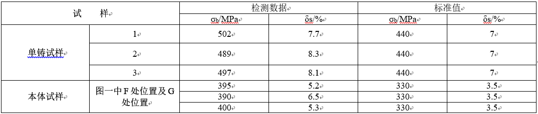 圖6:鑄件方盤上部氣孔 2.2 力學性能測試 ZL205A基座鑄件單鑄試樣與鑄件本體切取試樣力學性能測試在WE-100型數顯液壓萬能試壓機上完成,每個部位取3個試樣進行測試并取其平均值,結果見表3。
