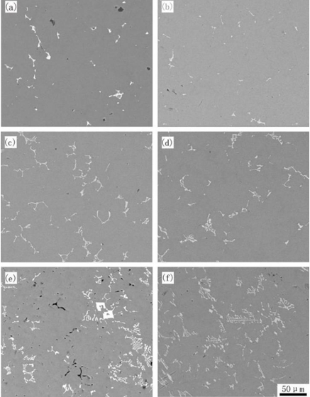 圖1:在不同F(xiàn)e 含量和擠壓壓力下合金的背散射SEM微觀組織
