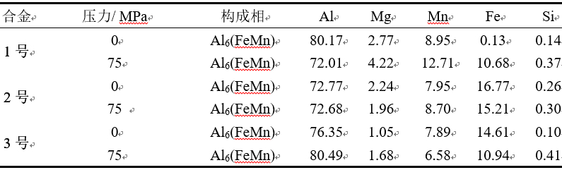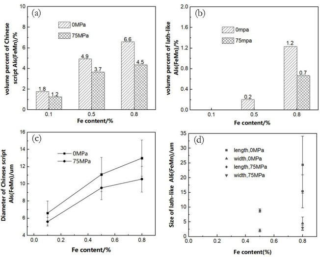 表2:富鐵相的能譜分析結(jié)果 wb/% 不同壓力和不同F(xiàn)e 含量下的Al6(FeMn)相體積分?jǐn)?shù)和尺寸的變化見圖2。由圖2a,圖2b可知,漢字狀和板條狀A(yù)l6(FeMn)相的體積分?jǐn)?shù)隨著鐵含量的增加而增加,當(dāng)擠壓壓力為75 MPa時,合金中的漢字狀和板條狀A(yù)l6(FeMn)相的體積分?jǐn)?shù)減少。由圖2c可知,漢字狀A(yù)l6(FeMn)相的尺寸隨著Fe含量的增加而增大。當(dāng)擠壓壓力為0時,隨著Fe含量從0.1%增加到0.8%,漢字狀A(yù)l6(FeMn)相的尺寸由6.6 μm增大到12.8 μm。然而75 MPa的擠壓壓力明顯降低了漢字狀A(yù)l6(FeMn)相的尺寸,降低了約50%。由圖2d可知,板條狀A(yù)l6(FeMn)相的長度和寬度隨著Fe含量的增加而急劇增大。當(dāng)擠壓壓力為0時,隨著Fe含量從0.1%增加到0.8%,棒狀A(yù)l6(FeMn)相的平均長度增大到24.4μm,平均寬度增大到4.5μm。然而75 MPa的擠壓壓力顯著減小板條狀A(yù)l6(FeMn)相的長度和寬度,隨著Fe含量從0.1%增加到0.8%,板條狀A(yù)l6(FeMn)相的平均長度增大到15.4 μm,平均寬度增大到3 μm。