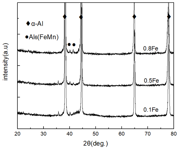 圖2:合金微觀組織中Al6(FeMn)相的定量分析:(a)漢字狀A(yù)l6(FeMn)相的體積分?jǐn)?shù);(b)板條狀A(yù)l6(FeMn)相的體積分?jǐn)?shù);(c)漢字Al6(FeMn)相的尺寸;(d)板條狀A(yù)l6(FeMn)相的尺寸 圖3:為當(dāng)擠壓壓力為0 MPa 時不同F(xiàn)e 含量合金XRD 譜圖。可以看出合金中相的組成為α(Al)+ Al6(FeMn),隨著Fe含量增加,Al6(FeMn)相的衍射峰也逐漸增加。XRD結(jié)果進(jìn)一步證明,合金中存在的富鐵相為Al6(FeMn),與能譜分析結(jié)果一致。