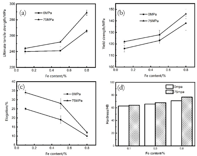 圖4:不同F(xiàn)e含量合金和不同壓力下合金的力學(xué)性能