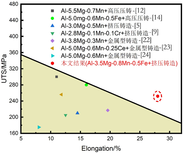 ![]() 原標(biāo)題:Fe含量對擠壓鑄造Al-3.5Mg-0.8Mn合金組織與性能的影響 摘要:采用拉伸和硬度測試、掃描電鏡和X 射線衍射儀等手段,研究了不同F(xiàn)e含量對擠壓鑄造Al-3.5Mg-0.8Mn合金顯微組織和力學(xué)性能的影響。結(jié)果表明,F(xiàn)e能改善合金的力學(xué)性能,合金中只存在Al6(FeMn)相。合金的抗拉強(qiáng)度和屈服強(qiáng)度隨著Fe含量的增加而增大,伸長率隨著Fe含量的增加而降低,原因是隨著Fe含量增加,硬脆的Al6(FeMn)相的增多。在擠壓壓力為75 MPa和Fe含量為0.5 %時,合金綜合力學(xué)性能最佳,其抗拉強(qiáng)度為252 MPa,屈服強(qiáng)度為128 MPa,伸長率為28 %。 隨著節(jié)能減排和綠色鑄造趨勢的加強(qiáng),交通領(lǐng)域安全結(jié)構(gòu)件的輕量化日益得到重視,尤其是新能源汽車領(lǐng)域,對高強(qiáng)、高韌、輕質(zhì)鋁合金安全結(jié)構(gòu)件的需求愈加強(qiáng)烈。Al-Mg系鋁合金具有密度小、比強(qiáng)度高、成形性好、耐腐蝕、可焊性好等特點,是交通領(lǐng)域安全結(jié)構(gòu)件上得到關(guān)注。然而,Al-Mg系鋁合金因其較差的熔鑄性能和較低的強(qiáng)度,限制了其作為交通領(lǐng)域安全結(jié)構(gòu)件的使用。 Al-Mg-(Mn)合金是非熱處理型鋁合金,因此減少了熱處理的成本和零件的變形。為了改善和提高鋁鎂合金的熔鑄性能和力學(xué)性能,目前主要有兩種途徑:一是改變成形工藝,比如采用壓力鑄造來生產(chǎn)鋁鎂合金精密零部件。但由于氣體卷入,導(dǎo)致性能較差。擠壓鑄造具有工藝簡單、成本低、產(chǎn)品性能好、質(zhì)量可靠等特點,能實現(xiàn)近凈成形,生產(chǎn)高質(zhì)量鑄件取代鍛件。廣泛應(yīng)用于Al-Si、Al-Cu和Al-Zn合金的成形。目前為止,針對擠壓鑄造Al-Mg-(Mn)合金的研究報道還較少。另外,合金化也是提升Al-Mg合金性能的主要途徑之一,主要通過添加Sc、Zr、Cu等元素來實現(xiàn),大幅提升了合金的成本。Ji等研究Fe含量對壓鑄Al-Mg-Mn合金組織和性能的影響,發(fā)現(xiàn)在保留較高伸長率的基礎(chǔ),F(xiàn)e含量可以顯著提升合金的強(qiáng)度。此外,F(xiàn)e作為鋁合金中常見的雜質(zhì)元素,一般無法避免,在廢鋁回收過程中還會不斷累積。前期研究結(jié)果發(fā)現(xiàn),在擠壓鑄造高鐵含量鋁銅合金中,擠壓鑄造可以改善雜質(zhì)Fe對鋁銅合金的危害,有利于廢鋁的回收再利用。 基于此,本課題采用擠壓鑄造技術(shù)開發(fā)了高鐵含量Al-Mg-Mn合金,主要研究Fe含量對擠壓鑄造非熱處理型Al-3.5Mg-0.8Mn合金顯微組織和力學(xué)性能的影響,為高性能、低成本、易再生的高鐵含量非熱處理型擠壓鑄造Al-Mg-Mn合金提供參考,以滿足交通領(lǐng)域高強(qiáng)、高韌、輕質(zhì)鋁合金安全結(jié)構(gòu)件的需求。 1、試驗材料和方法 試驗所用原料(質(zhì)量分?jǐn)?shù))為:純度為99.8%的鋁錠、純度為99.97%的純鎂、Al-10Mn、Al-14Mn、Al-5Ti-B中間合金。在井式電阻爐中進(jìn)行合金熔煉,熔體經(jīng)過精煉、除氣、扒渣后,于720 ℃左右進(jìn)行澆注,制備Al-3.5Mg-0.8Mn-XFe合金,其化學(xué)成分見表1。