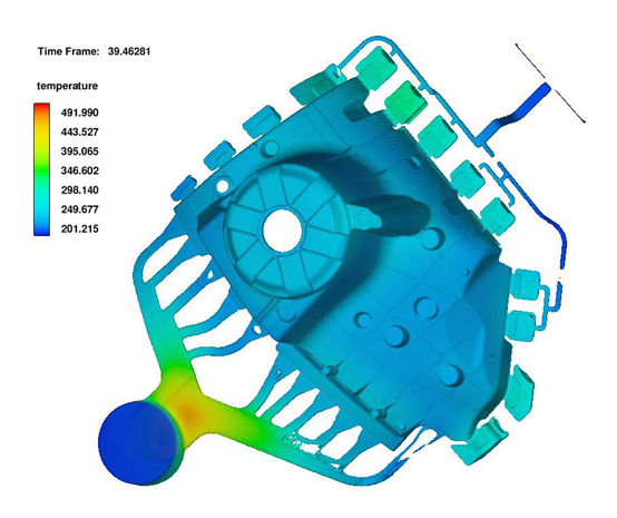 圖6. 凝固過程模擬 圖6為金屬液完全凝固后所得鑄件的形狀。可以看到,在減震塔零件中的凸起結構上部存在一較大的孔洞缺陷,觀察其局部放大圖可以發(fā)現(xiàn),在該處存在兩個尺寸較大的近圓柱形凸臺,高度達到20mm。在凝固過程中,這一厚大部位凝固速度較慢,會發(fā)生補縮現(xiàn)象,形成孔洞。 對此,采取局部激冷的方法加快該部位的凝固速度,以獲得致密的鑄件。在該處的模具上加入激冷銅塊以達到激冷的目的[13],其模擬結果如圖7所示,得到內(nèi)部致密無孔松的健全鑄件。最后采用該工藝實際生產(chǎn)出合格的鋁合金減震塔零件,成品率達到90%以上。若通過控制模具溫度等其他條件,成品率有望進一步提高。