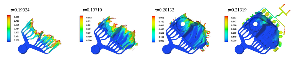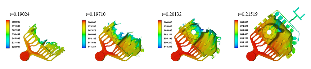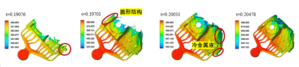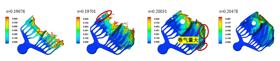 卷氣(色標代表卷入氣體體積分數(shù)):(a)t=0.190s; (b)t=0.197s; (c)t=0.201s; (d)t=0.215s. 圖5為金屬液在帶有澆注系統(tǒng)以及溢流槽、排氣槽的壓鑄模具中的充型過程。可以看出,在金屬液充型過程中,位于液-氣界面前沿的溫度較低、卷氣嚴重的部分金屬液全部進入設計好的溢流槽中,金屬液充滿型腔后(圖5(d)),留在零件內(nèi)部的氣體量極少。因此,設計的溢流槽、排氣槽適用于該減震塔零件的壓鑄工藝。