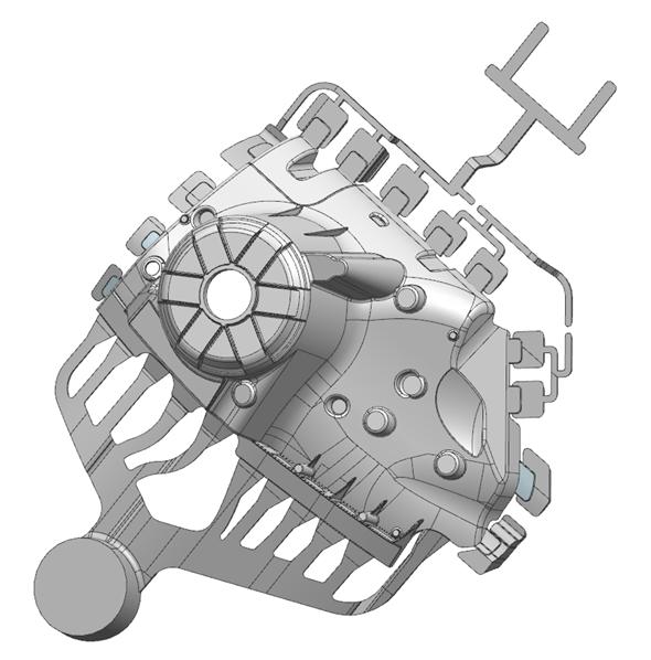 圖7 局部激冷后得到的健全鑄件 4、結論 (1)設計、優(yōu)選出大型、復雜汽車結構件——鋁合金減震塔的壓鑄澆注系統(tǒng)及溢流和排氣系統(tǒng)。 (2)利用數(shù)值模擬方法分析了減震塔零件的卷氣發(fā)生部位和區(qū)域,預測了壓鑄缺陷的種類及位置,以此為基礎更改了澆注系統(tǒng)的設計。 (3)在壁厚尺寸較大圓形結構處容易發(fā)生卷氣現(xiàn)象和縮孔缺陷,采用局部激冷方法等工藝措施,消除了缺陷,獲得整體質(zhì)量良好的鋁合金減震塔壓鑄件。