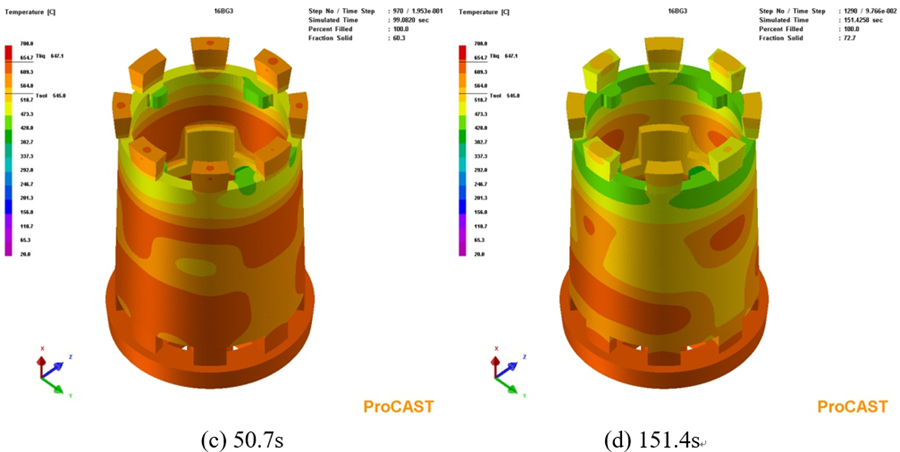 圖10:改進設計后鑄件充型過程溫度場 圖11為合金液充型結束后凝固過程中鑄件于不同時間的溫度分布圖。可以看出,合金液充型結束后,鑄件降溫最快區(qū)域為鑄件頂部的上端框處。該區(qū)域合金液最先進入型腔,再加上上端框處放置著冷鐵,合金液冷卻速度較快,溫度最低;冒口相對上端框部位的凝固溫度更高,凝固時間更長,冒口對上端框區(qū)域具有一定的補縮作用。整個鑄件自上而下溫度逐漸升高,符合自上而下逐層順序凝固的設想。隨著時間延長,鑄件整體的溫度逐漸下降,但整個降溫過程中鑄件一直保持著自下而上溫度逐漸升高的正溫度梯度,能最大限度地發(fā)揮冒口的補縮作用,降低鑄件內部縮松類缺陷的傾向,有利于改善整個鑄件的品質。鑄件的整個凝固過程中沒有出現(xiàn)局部過熱情況,完全呈現(xiàn)出自上而下的順序凝固,鑄件的縮松傾向相對于改進前大大減小。
