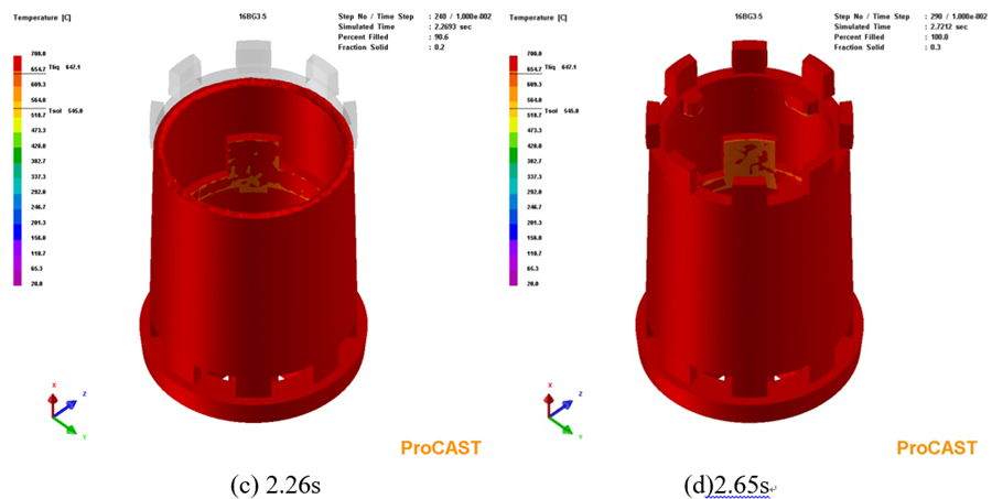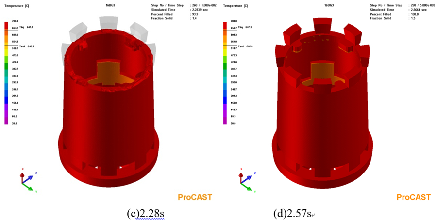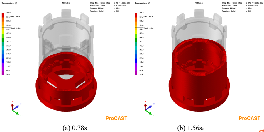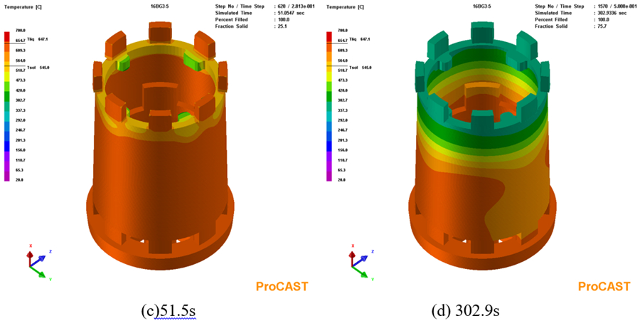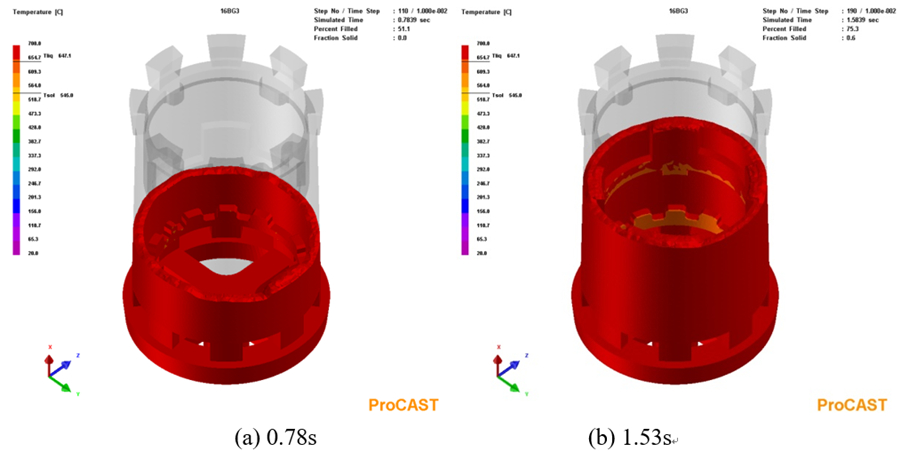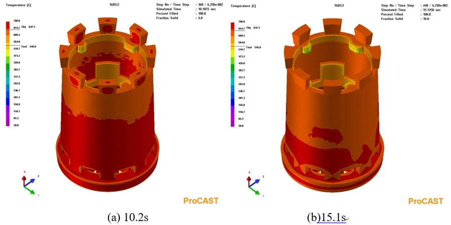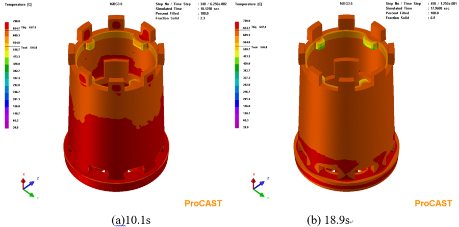 圖6:鑄件充型過程溫度場 圖7為合金液充型結束后凝固過程中鑄件于不同時間的溫度分布。可以看出,合金液充型結束后,鑄件降溫最快區(qū)域為鑄件頂部的上端框處,因為該區(qū)域合金液最先進入型腔的,再加上上端框處放置著冷鐵,合金液冷卻速度較快,溫度最低;冒口相對上端框部位的凝固溫度更高,凝固時間更長,冒口對上端框區(qū)域具有一定的補縮作用。整個鑄件自上而下溫度逐漸升高,符合自上而下逐層順序凝固的設想。隨著時間延長,鑄件整體的溫度逐漸下降,但整個降溫過程中鑄件一直保持著自下而上溫度逐漸升高的正溫度梯度,這能最大限度地發(fā)揮冒口的補縮作用,降低鑄件內部縮松類缺陷的傾向,對整個鑄件的質量改善是有利的。但在鑄件的局部區(qū)域存在一些熱節(jié),這些位置相對于周圍在同一時間溫度更高,凝固時間更長,在后期凝固過程中得不到周圍合金液的補縮,容易出現(xiàn)縮松等收縮類缺陷。