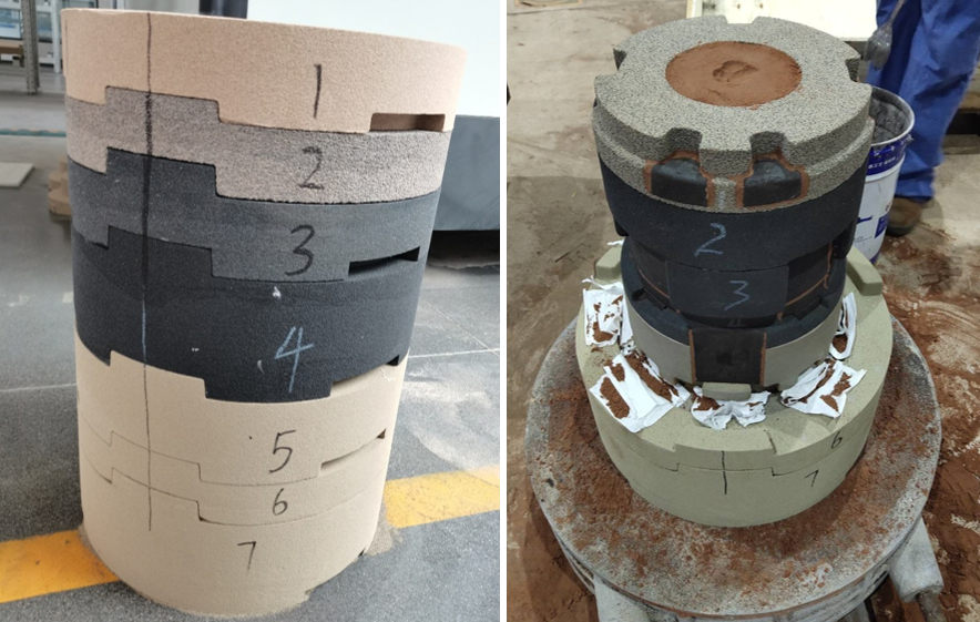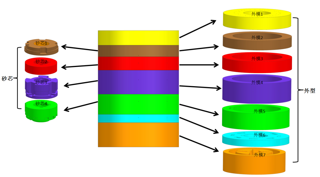 圖3:冷鐵結構及分布示意圖 2.3 復合鑄型設計 為最大限度地實現(xiàn)澆注系統(tǒng)對鑄件的補縮,發(fā)揮低壓鑄造的優(yōu)勢,結合型砂的激冷能力設計由上而下的凝固順序,設計鑄型結構見圖4,采用無模切砂的方式制備各部分砂塊,外部砂型共分為7層,最上面第1層是硅砂層,第2層是鐵砂,第3層鉻鐵礦砂層,第4層是寶珠砂層,第5層、第6層、第7層是陶粒砂層。砂芯由上而下分為4層,第1層為鐵砂,第2層為鉻鐵礦砂,第3層為寶珠砂,第4層為陶粒砂。