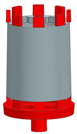 圖1:筒形件三維模型圖 2、鑄造工藝設計 2.1 澆注系統(tǒng)設計 為了保證鑄件的內部質量,該筒形件采用低壓鑄造成形,合金液自下而上平穩(wěn)充型,減少氧化,鑄件在一定的壓力下進行凝固,組織致密度優(yōu)于重力鑄造致密。設計筒形件的澆注系統(tǒng)見圖2,整個澆注系統(tǒng)的形式為底注雨淋式澆注系統(tǒng),由直澆道、環(huán)形橫澆道和扁平內澆道組成。底注雨淋式的優(yōu)點為鑄件的工藝出品率高,切割、粗加工等后處理工序簡單。環(huán)形橫澆道與直澆道的連接采用“十”字形澆道,有利于合金液的流量分配更加均勻合理,各個內澆口進入型腔的合金液的溫度也更加均勻。 由于鎂合金非常容易氧化,8個直澆道在筒形件下端框處均勻分布,合金液自下而上平穩(wěn)充型,減少了合金液的飛濺、卷氣等,減少合金液的氧化,從而減輕合金液的氣孔、氧化夾渣缺陷傾向。鑄件上方的8個冒口也具有貯氣和集渣的作用,進一步減輕了合金液的氣孔、氧化夾渣缺陷傾向。同時型腔上方的合金液一直比下方的合金液先進入型腔,整個澆注和凝固過程中上方的合金液溫度一直低于下方的合金液溫度,有利于實現(xiàn)自上而下的凝固順序,充分發(fā)揮內澆道的補縮作用,減輕鑄件的縮松傾向,提高鑄件的致密度。