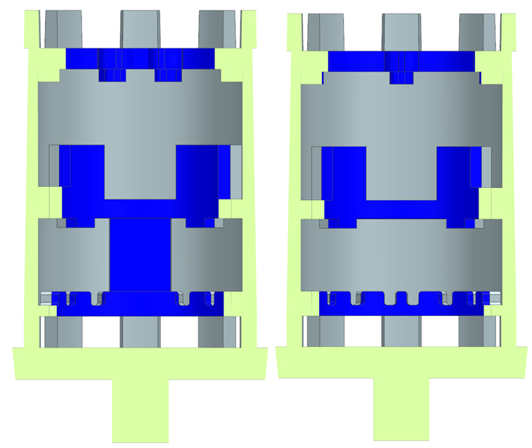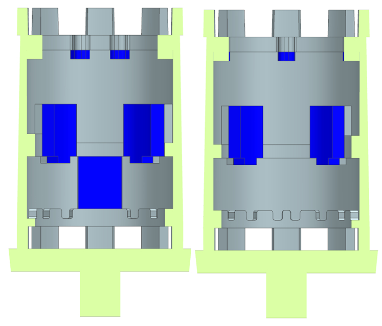 圖9:改進后的冷鐵結構及分布示意圖 在改進工藝的基礎上,通過ProCAST對筒形件鑄件的澆注充型過程、凝固過程以及缺陷預測進行模擬仿真,充型過程見圖10。可以看出,合金液通過內澆道進入鑄件型腔后,首先進入鑄件的下端框厚壁區(qū)域,隨后流經艙體中部區(qū)域,之后流到上端框厚壁區(qū)域,最終從鑄件底部由下而上逐步充滿鑄型型腔,鑄件整體呈現(xiàn)自下而上依次充型。整個過程中,合金液充型比較平穩(wěn),直至全部充滿型腔。在充型過程中,合金液平穩(wěn),不容易發(fā)生卷氣現(xiàn)象,氣孔和氧化夾渣等鑄造缺陷產生的傾向小。