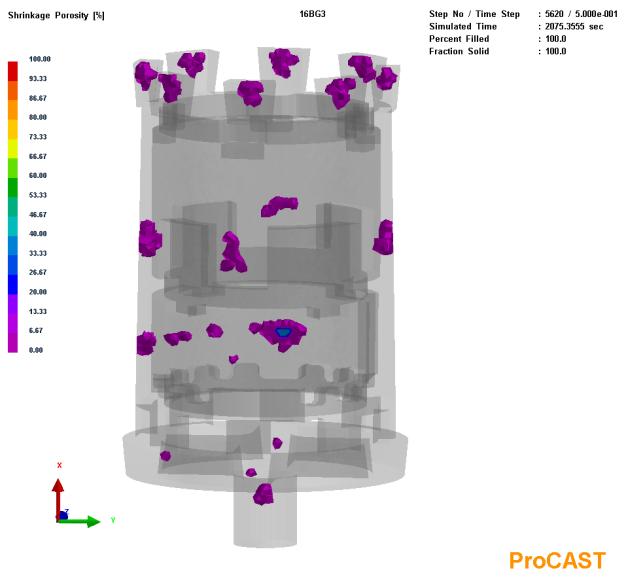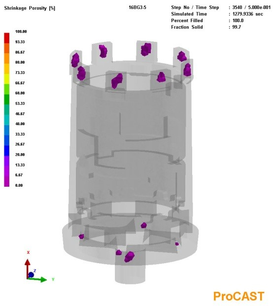 圖11:改進設計后鑄件凝固過程溫度場 鑄件模擬結果的缺陷預測見圖12。可以看到,除了澆注系統(tǒng)和冒口中的縮孔、縮松缺陷外,在鑄件的中下部薄壁區(qū)域和中部凸臺之間的薄壁區(qū)域的縮松缺陷得到消除,這與鑄件凝固過程溫度場的結果也是一致的。