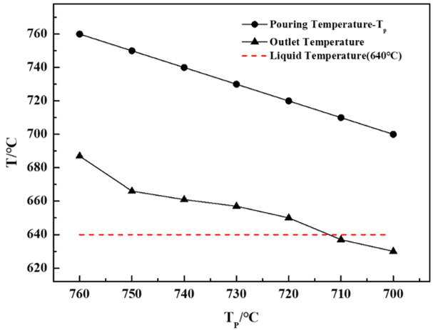 圖2:Al-5Zn-2Mg-1Cu-0.2Sc合金漿料的澆注溫度和出口溫度關系圖