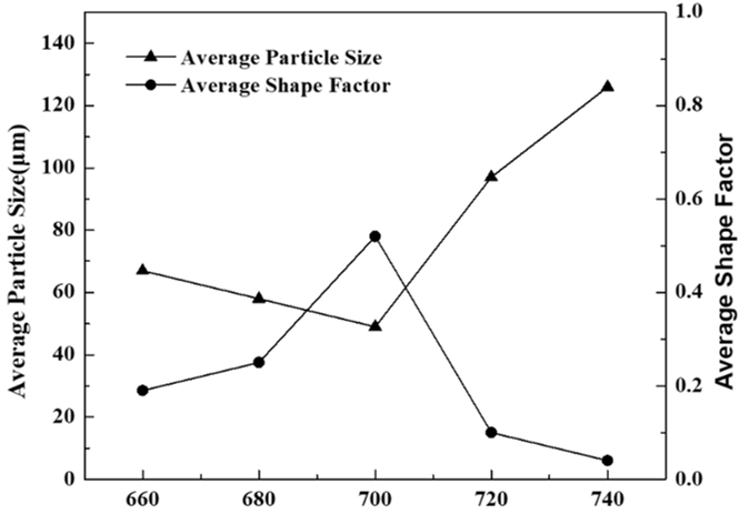 圖3:澆注溫度為690℃時,漿料在滾筒筒壁上形成的凝固殼 2.2 澆注溫度對漿料組織的影響 圖4和圖5分別為不同澆注溫度下漿料的金相組織和XRD圖譜。可以看出,合金主要由初生α-Al、 MgZn2、AlCuMg、Al2Cu和Al3Sc等第二相組成。隨著澆注溫度的降低,漿料中的初生α-Al枝晶逐漸減少,近等軸狀初生相逐漸增加,晶粒尺寸減小,平均圓整度增加,見圖6。 當澆注溫度為740 ℃時,初生α-Al晶粒平均尺寸為67.4 μm,平均圓整度為0.16,晶粒主要呈現出兩種不同的形態:尺寸較大的薔薇狀和樹枝晶和尺寸較小的近等軸晶,其圓整度較低,見圖4a。當澆注溫度降低到720 ℃時,開始出現尺寸較小的近球形晶粒。隨著溫度進一步降低到700 ℃,薔薇狀晶粒基本消失,且α-Al平均晶粒尺寸降低到35.1 μm,圓整度提升至0.49,此時半固態漿料質量最佳。