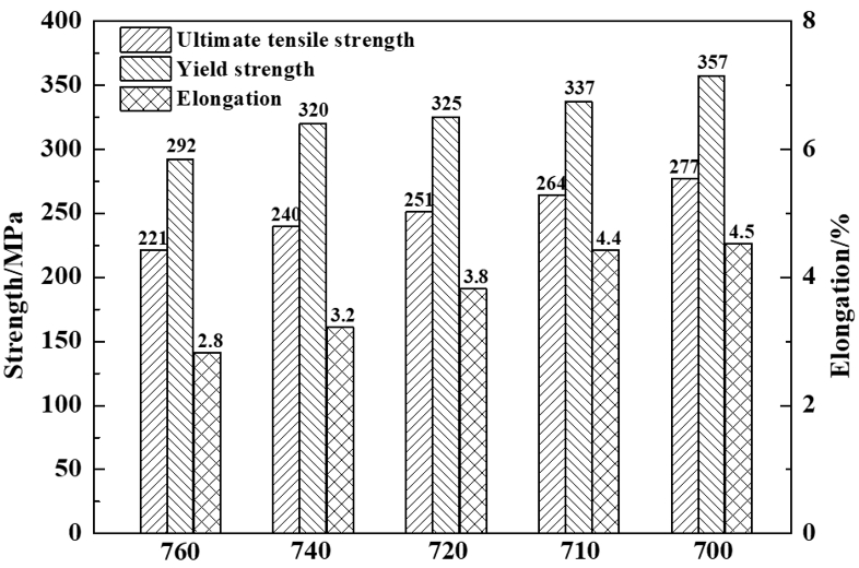 圖8:不同澆注溫度下流變擠壓鑄造合金的SEM組織(a)760℃ (b)740℃ (c)720℃ (d)710℃ (e)700℃ 2.3.2 力學性能 不同澆注溫度下流變擠壓鑄造合金的力學性能隨著澆注溫度的變化見圖9。可以看出,隨澆注溫度降低,合金力學性能提高。當澆注溫度為700 ℃時,鑄態合金力學性能最佳,其屈服強度、抗拉強度和伸長率分別為277 MPa、357 MPa和4.5%。