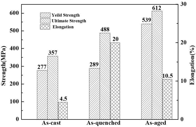 圖13:120 ℃×24 h時效后合金的TEM明場和暗場分析 2.4.3 力學性能 對熱處理合金進行力學性能測試,并與鑄態合金相對比,結果見圖14。對合金進行時效處理后屈服強度、抗拉強度和伸長率可達539 MPa、612 MPa和10.5%,與變形合金7075-T651性能相當。