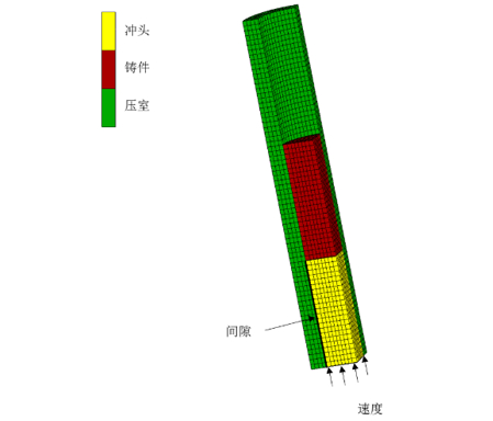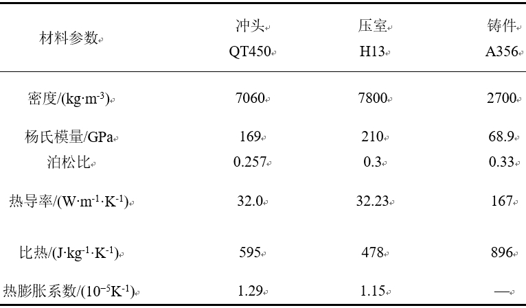 表1:各組件的材料參數(shù) 后處理中,選取沖頭內(nèi)部距離上表面10 mm處的節(jié)點(diǎn),壓室上的節(jié)點(diǎn)對(duì)應(yīng)于沖頭該節(jié)點(diǎn)的路徑,從而便可以得到壓射機(jī)構(gòu)的實(shí)時(shí)間隙值(Ci)和換熱溫差(Td);并且定義間隙率(Rg)為實(shí)時(shí)間隙與初始間隙的比值,用來(lái)對(duì)比在不同參數(shù)下的間隙變化程度。