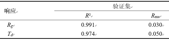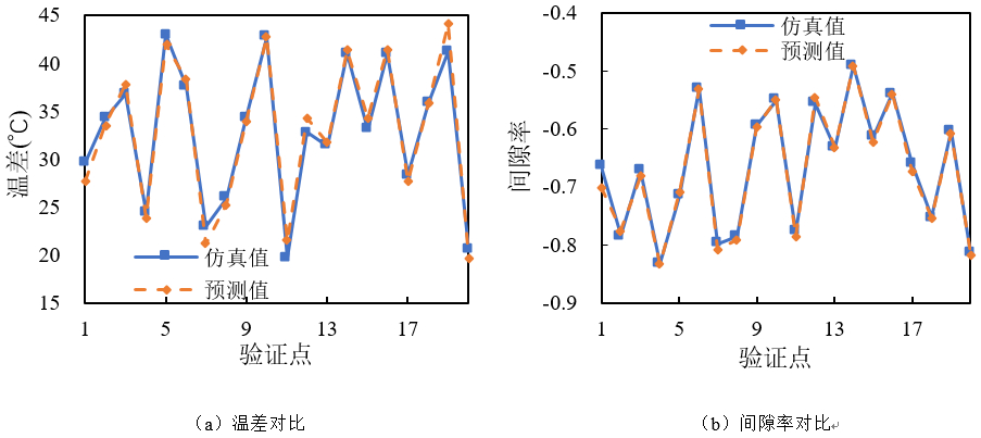 圖6:模型精度驗(yàn)證 檢驗(yàn)預(yù)測(cè)的精度一般通過(guò)擬合優(yōu)度(R²)來(lái)判斷搭建的模型的精度,R²的取值范圍為0~1,R²的值越接近1,說(shuō)明預(yù)測(cè)模型的預(yù)測(cè)效果越好。表2為驗(yàn)證集關(guān)于間隙率和溫差的擬合優(yōu)度值和均方誤差,R²的值均高于0.97,均方誤差(Rms)也在0.04左右。說(shuō)明Kriging元模型能夠精確地預(yù)測(cè)到未知的響應(yīng),也建立了近似的輸入輸出關(guān)系。