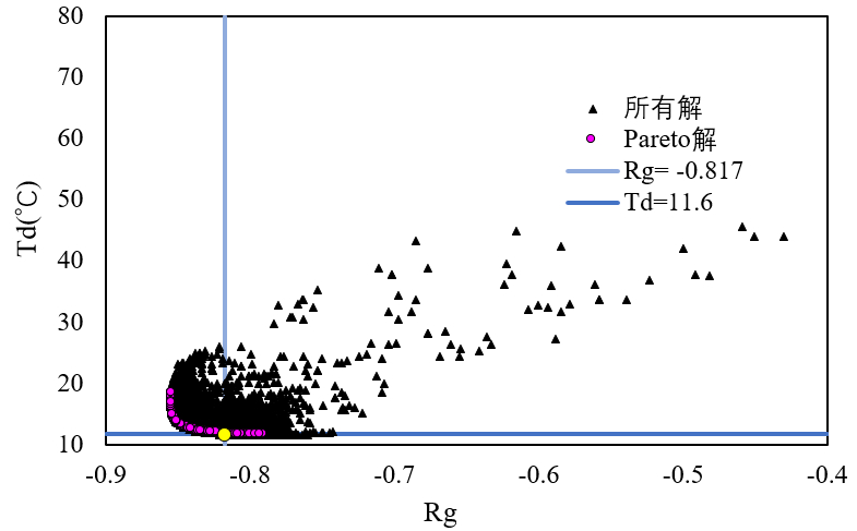 表2:Kriging元模型在各指標(biāo)下的結(jié)果 4.2 多目標(biāo)優(yōu)化結(jié)果 采用NSGA-Ⅱ算法實(shí)現(xiàn)對(duì)工藝參數(shù)的多目標(biāo)尋優(yōu),獲取這兩個(gè)優(yōu)化目標(biāo)間的折中解。圖7為多目標(biāo)優(yōu)化解,包括Pareto解。最后選取的最優(yōu)加工目標(biāo)的工藝參數(shù)分別為701、338、16、0.1061、56,間隙率和換熱溫差分別為-0.817、11.6。