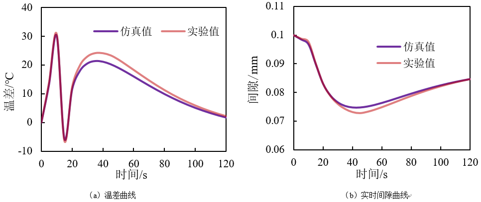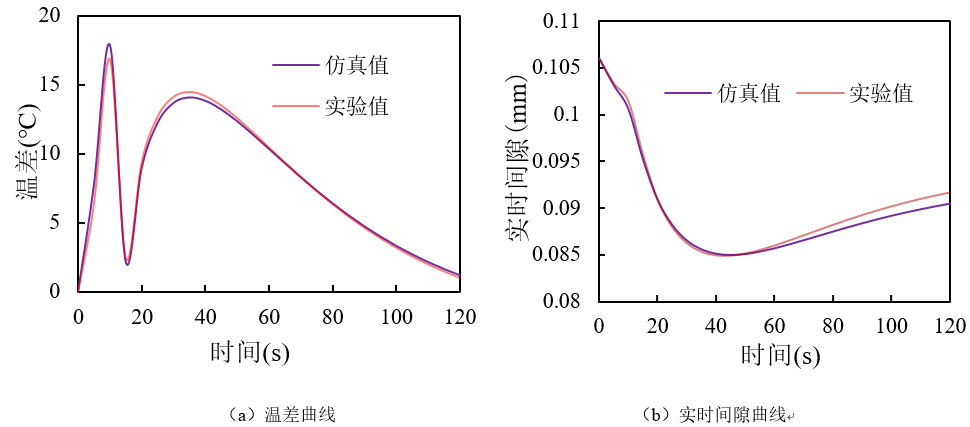 1.壓室;2.預(yù)熱圈;3,4,5.千分尺測(cè)距儀;6.沖頭;7.應(yīng)變片;9.底座;10.推桿;8,11,12,13,14.熱電偶;15.鑄件 圖3:壓射機(jī)構(gòu)裝配圖: 2.2物理試驗(yàn)與仿真試驗(yàn)的對(duì)比 壓射機(jī)構(gòu)的充型過(guò)程在120 s內(nèi)完成,因此按照式(1)和式(2)計(jì)算得到圖4的趨勢(shì)圖。從圖4可以看到,有限元仿真值與物理試驗(yàn)有相同的趨勢(shì);間隙率的最大誤差不超過(guò)5%,溫差的最大誤差不超過(guò)12%。實(shí)際中鑄件在澆注時(shí)溫度變化較快,即試驗(yàn)中鑄件溫度與模擬所設(shè)置參數(shù)可能存在出入,因此,可認(rèn)為該數(shù)據(jù)在誤差范圍內(nèi),有限元仿真準(zhǔn)確有效。另外,在20 s之后,溫差和實(shí)時(shí)間隙都出現(xiàn)了極值,且趨勢(shì)一致,表明溫差對(duì)實(shí)時(shí)間隙存在約束作用。仿真得到換熱溫差和間隙率分別為21.2、-0.749;試驗(yàn)得到換熱溫差和間隙率分別為24.1、-0.73。
