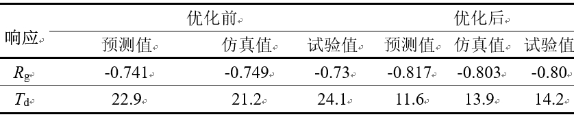 圖7:多目標(biāo)優(yōu)化解 為驗(yàn)證該最優(yōu)工藝參數(shù)的可行性,進(jìn)行仿真和試驗(yàn)驗(yàn)證。最后得到的趨勢(shì)圖見(jiàn)圖8,仿真和實(shí)驗(yàn)曲線具備較高擬合度,其誤差不超過(guò)5%。同時(shí),仿真得到換熱溫差和間隙率分別為13.9、-0.803;試驗(yàn)得到換熱溫差和間隙率分別為14.2、-0.80。二者得到的結(jié)果與基于Kriging元模型得到的優(yōu)化解十分接近,并且相對(duì)于圖5的初始結(jié)果更小,說(shuō)明優(yōu)化后,沖頭和壓室之間的配合間隙變化程度減小。優(yōu)化前后的溫差和間隙率見(jiàn)表3,優(yōu)化后的換熱溫差減小了49 %,間隙率減小了10 %。因此,可以判定,優(yōu)化后的壓射機(jī)構(gòu)工藝參數(shù)能夠減小壓射機(jī)構(gòu)的配合間隙變化,使充型過(guò)程更加穩(wěn)定。