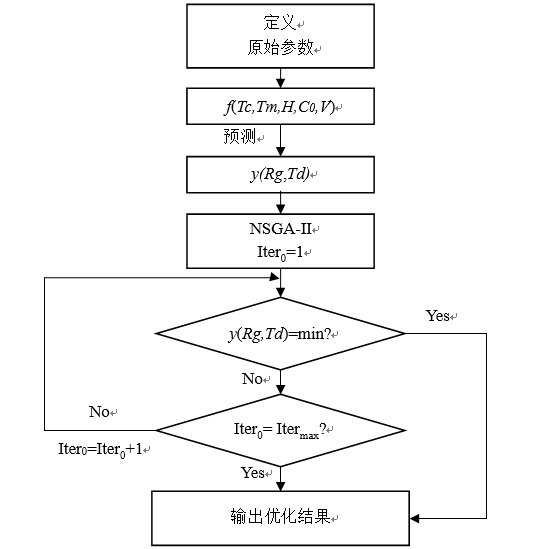 針對(duì)式(11),建立了樣本集和驗(yàn)證集,樣本集用于Kriging建模,驗(yàn)證集用于Kriging模型驗(yàn)證。回歸模型選擇0階多項(xiàng)式,相關(guān)函數(shù)選擇高斯函數(shù)。其響應(yīng)值通過(guò)模擬獲得。 NSGA-Ⅱ算法在求解多目標(biāo)函數(shù)問(wèn)題具有優(yōu)勢(shì),因此利用NSGA-Ⅱ算法進(jìn)行求解。圖5為算法求解的流程圖。