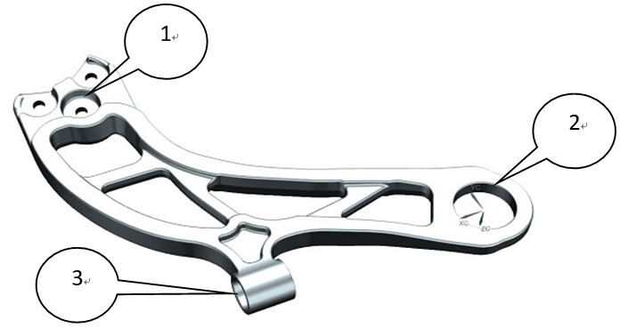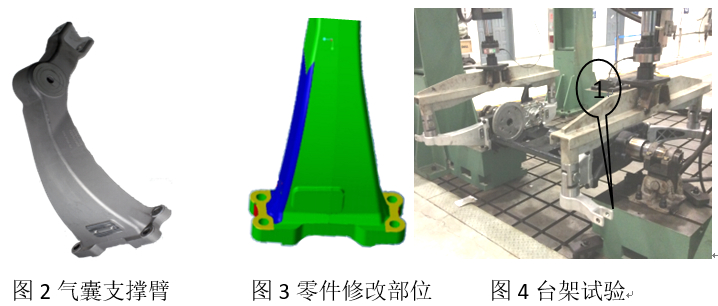 表2:鋁合金轉(zhuǎn)向節(jié)材料力學(xué)性能檢測結(jié)果 對擠壓鑄造鋁合金轉(zhuǎn)向節(jié)樣件加工并與對偶件裝配后進行臺架試驗,測試儀器為SCHENCK生產(chǎn)的160 KN/100mm液壓伺服試驗設(shè)備,試驗加載力的大小、方向、加載頻率等試驗參數(shù)均與原鑄鐵轉(zhuǎn)向節(jié)相同。對轉(zhuǎn)向節(jié)進行典型工況的靜強度及疲勞耐久試驗,樣件均未出現(xiàn)裂紋、變形等不符合狀況,通過了臺架試驗。 2、在汽車氣囊支撐臂中的應(yīng)用 氣囊支撐臂是汽車輪邊驅(qū)動橋的核心支撐零件,見圖2,它與汽車箱體、減震器氣囊模塊、驅(qū)動系統(tǒng)相連,具有承載汽車后部載荷,支撐驅(qū)動橋并為減震氣囊起緩沖作用,在汽車行駛狀態(tài)下,承受著多變的沖擊減震載荷。其主要失效方式為疲勞破壞。 汽車氣囊支撐臂原來主要由球墨鑄鐵鑄造而成,為了實現(xiàn)汽車輕量化,國外開始研發(fā)高性能鋁合金氣囊支撐臂,由鑄鐵件、鑄鋼件向鋁合金鍛造件的升級換代,以實現(xiàn)氣囊支撐臂產(chǎn)品的輕量化。該鋁合金氣囊支撐臂用于某新能源汽車中巴,力學(xué)性能要求:本體取樣抗拉強度〉300 MPa,屈服強度〉210 MPa,斷后伸長率>8%。 該產(chǎn)品在開發(fā)初期產(chǎn)品臺架試驗曾發(fā)生斷裂,后經(jīng)對產(chǎn)品結(jié)構(gòu)的改進,見圖3, ?處的產(chǎn)品邊界往箭頭所指方向左移5 mm, ?處取消過渡圓弧成直線,螺栓安裝孔面抬高5 mm。改進后的零件整體剛度得到加強,受力情況更加合理,從產(chǎn)品本體取樣力學(xué)性能測試結(jié)果見表3,后經(jīng)多輪臺架試驗產(chǎn)品性能完全滿足了設(shè)計要求,產(chǎn)品臺架試驗見圖4。