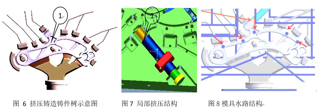 圖5:鋁合金控制臂 圖5為鋁合金控制臂零件,最大外形尺寸為320 mm×154 mm,平均壁厚為12 mm,結(jié)構(gòu)根據(jù)拓撲優(yōu)化,提取骨架,結(jié)合裝配要求最終設(shè)計成帶弧形型彎曲外形的桿系結(jié)構(gòu)。其在三個位置上存在裝配受力關(guān)系,對優(yōu)化后的結(jié)構(gòu)進行受力分析,見表4,應(yīng)力和變形滿足設(shè)計要求。鋁合金鑄件整體質(zhì)量為2.5 kg,從該鑄件結(jié)構(gòu)特點上看,鑄件結(jié)構(gòu)簡單、壁厚適中,適合于采用擠壓鑄造成形。圖6為擠壓鑄造鑄件樹示意圖,圖7為局部擠壓結(jié)構(gòu)圖,圖8為動模水路結(jié)構(gòu),圖9是擠壓鑄造控制臂X光探傷圖,從X光照片可以看出:擠壓鑄造控制臂在大孔處局部有微觀縮松外,其他部位未發(fā)現(xiàn)有縮孔、縮松缺陷。