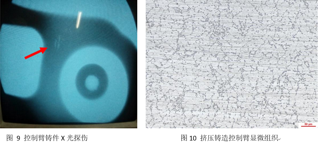 圖10是擠壓比壓為100 MPa條件下控制臂鑄件的顯微組織圖,可以看出擠壓鑄造控制臂的金相組織為:α+共晶體,在擠壓鑄造條件下,由于擠壓力的存在提高了鑄件的凝固速度,使初生α相的晶粒有了一定的細化。從控制臂鑄件本體取樣進行力學(xué)性能測試,鑄件各個位置力學(xué)性能相當,抗拉強度均大于300 MPa,屈服強度大于230 MPa,伸長率大于8%。滿足設(shè)計要求。經(jīng)100萬次臺架試驗產(chǎn)品的各項性能指標完全滿足技術(shù)要求,其中剛度指標高于原來鑄鋼件。