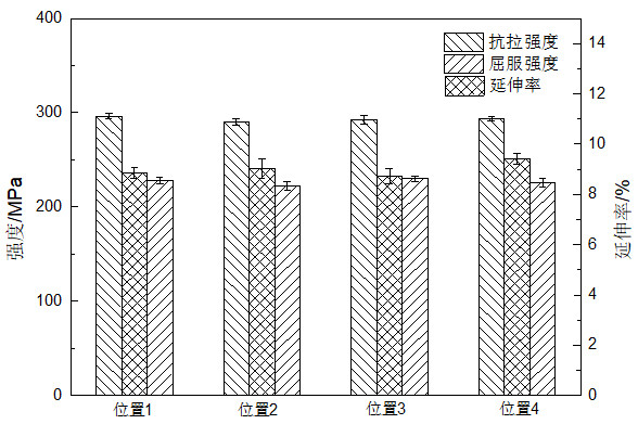 圖7:擠壓鑄造生產的鋁合金控制臂鑄件 受鑄件尺寸和結構的限制,本體取樣時按客戶要求,在多個鑄件上指定位置分別取若干非標試樣(基于GB T 228.1-2010),拉伸試驗結果見圖 8。抗拉強度為293.2 MPa、屈服強度為226.48 MPa、伸長率為9.01%,且全部高于設定值。后期在主機廠進行的臺架試驗、NVH測試、裝車試驗、碰撞試驗、耐久性試驗等多項檢測,全部通過,由此可見擠壓鑄造鋁合金控制臂的性能不低于鋼板沖焊下控制臂,由于涉及關鍵技術,主機廠并未透露相關試驗的具體數據和照片。