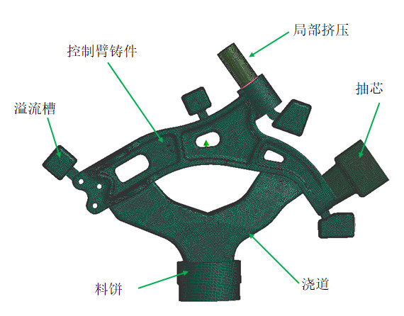 表1:原有結構與全新設計結構部件質量對比 3、工藝開發與試制 鋁合金控制臂鑄造工藝的基本設計見圖 5。采用立式擠壓機進行擠壓鑄造生產,澆注系統由料餅和“Y”字型的澆道組成,在鑄件上方設置溢流槽。通過左側的抽芯形成鑄件上與原有結構軸的安裝孔。通過設置抽芯形成在鑄件上部的連接孔,可以通過設置油缸的動作,在開模前插入,或是在充填過程中插入,當作擠壓針,消除鑄造缺陷。控制臂鑄件質量為2.282 kg,控制臂料餅及澆注系統質量為4.250 kg,溢流槽及排氣通道質量為0.660 kg,總質量為7.192kg,工藝出品率為31.7%,工藝出品率偏低。考慮到為試制開發部件,未對工藝出品率進行優化,在實際生產時可以考慮采用一模兩件的方式提高工藝出品率。
