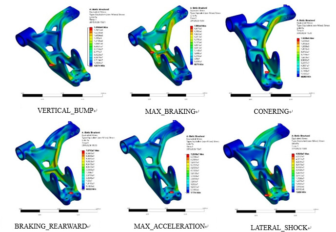 圖3:鋁合金控制臂設計方案 圖 3中1處,球頭組件采用原有結構,但取消原有焊接連接方式,在球頭鍛件上增加連接平面設計,通過螺栓連接的方式與控制臂主體連接,在控制臂主體上也相應的設計出連接平面和連接螺栓孔。2處將沖焊結構中控制臂主體中的減震器之間分為兩個部分,主體部分與控制臂為鑄件,其余部分設計為一個鋼板部件,通過螺釘與控制臂主體連接。3處在概念設計中試圖將該部分集成至鋁合金鑄件中,但是在CAE分析中發現,該部分的載荷較大,加之無法對結構進行更改,因而決定保留此部分的鋼制部件,在鋼制部件和控制臂主體上設計出連接結構,然后通過螺栓與控制臂主體連接。4處在原有設計中的高度傳感器支架無法集成入鋁合金鑄件中,所以需維持鋼板部件設計,通過螺釘與控制臂主體連接。 2.3 產品的結構分析 為保證結構分析結果的正確性,獲取了原有鋼板沖焊的控制臂的相關材料信息。原有控制臂由15個不同材料的鋼板部件通過焊接構成。通過相關鋼板標準的查詢,獲取了用于沖焊控制臂制造的不同鋼板材料的屈服強度、斷裂強度、斷后伸長率和楊氏模量,用于CAE對比分析。控制臂共有VERTICAL_BUMP,CORNERING,BRAKIING_REARWARD,MAX_BRAKING,MAX_ACCELERATION,LATERAL_SHOCK,CURB_PUSH 7種工況條件。考慮到擠壓鑄造鋁合金AlSi7Mg-T6的斷裂強度為220 MPa。在分析過程中,要求任何區域內的應力分布不能夠大于200 MPa。對于局部應力集中區域,可參考原有鋼板沖焊設計中的對比應力,確保全新結構設計結構與原有結構進行CAE對比分析時,相同部位鋁合金部件的應力不得超過鋼制部件的1/3。 圖 4為6種工況條件的應力分析結果,發現其應力水平能能夠滿足部件的使用需求。圖 4中VERTICAL_BUMP,MAX_BRAKING和CONERING工況為非破壞工況,其最大應力都未超過200 MPa,經過對高應力部位的分析,主要為應力集中,且位于螺栓孔和減振器支座根部,同時對比了原有鋼制部件同樣位置的應力,其數值未超過鋼制部件同樣位置應力的1/3,故而判定合格。為安全考慮,加大了減振器支座根部的圓角,以便于降低應力集中。 裝配檢查表明,全新設計結構沒有超出原有結構包絡面內,能夠滿足安裝條件。部件在局部結構更改過程中,沒有涉及與其他部件有裝配關系的部分,結構調整后,部件的裝配關系不變,可實現直接替換裝配。據此,確定設計數據。