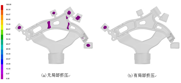 圖5:鋁合金控制臂鑄造工藝示意 采用ESI-ProCAST對鑄造過程進行模擬分析,圖 6為不應用局部擠壓和應用局部擠壓兩種方式鑄件缺陷的模擬結果。可以看出,在未應用局部擠壓的情況下,將局部擠壓針插入作為型芯使用;在應用局部擠壓的情況下,局部擠壓針先不插入模具內,待完成充填后,插入模具內,對尚未完成凝固的鑄件進行局部擠壓,消除鑄件內部缺陷。由圖 6a可知,在不應用局部擠壓的情況下,遠離澆口部位以及加強筋部位還存在一定數量的缺陷。由于鑄件凝固順序的原因,無法通過增加保壓時間和增壓壓力的方式消除此類缺陷。通過應用局部擠壓技術,可以有效地消除通過增加保壓時間和增壓壓力無法消除的缺陷,見圖 6b。