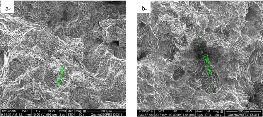 圖3:試樣3的斷口形貌(a. 大而深的韌窩;b. 二次拉伸裂紋)