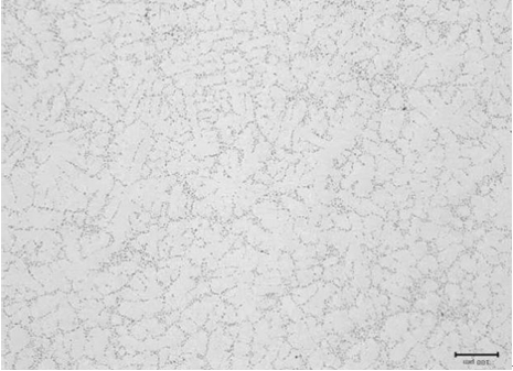 表1:鋁合金長臂件的熱處理規(guī)范。 1.2 試樣的制備及顯微組織觀察 斷口試樣從鋁合金長臂件最外端的厚壁較大部位截取。制備φ6mm圓棒拉伸試樣進(jìn)行拉伸試驗(yàn)后,選取力學(xué)性能較高的拉伸試樣斷口(試樣3)和較低的拉伸試樣斷口(試樣4)。試樣3的抗拉強(qiáng)度為324 MPa、伸長率為13.0%,試樣4的抗拉強(qiáng)度為298 MPa、伸長率為3.5%。 金相組織觀察用試樣1從試樣3的相鄰部位截取,試樣2從試樣4的相鄰部位截取。采用砂紙由粗到細(xì)磨至光亮后進(jìn)行拋光,采用0.5%氫氟酸水溶液浸蝕,用酒精清洗吹干后,在ZEISS型金相顯微鏡下觀察其顯微組織及可能存在的氣孔、氧化雜物、疏松及縮孔等缺陷。 在Quanta250FEG型熱場掃描電鏡下觀察斷口試樣3、試樣4斷口的形貌。 2、試驗(yàn)結(jié)果與分析 2.1 金相組織觀察