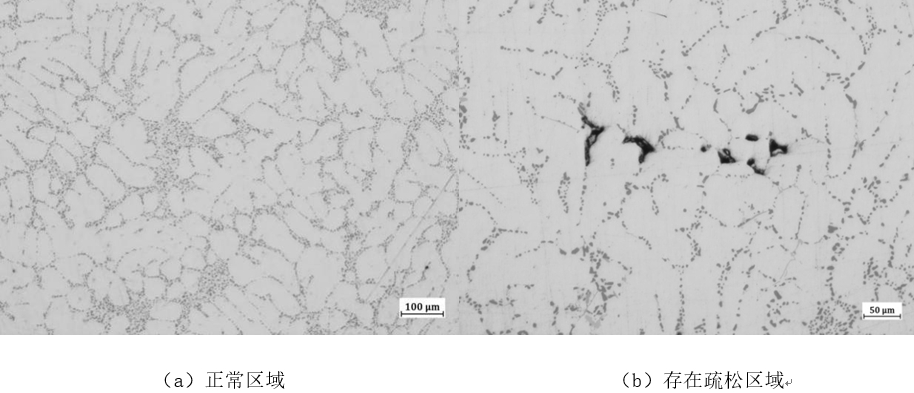 圖9:疏松缺陷的微觀斷口形貌(a. 試樣3;b. 試樣4) 3、結(jié)論 (1)鋁合金長臂件用A356合金經(jīng)過精煉、變質(zhì)和細(xì)化處理,鑄件的金相組織正常,晶粒細(xì)化,氣孔和氧化夾雜很少,對(duì)力學(xué)性能不穩(wěn)定的影響不大。 (2)當(dāng)鑄型溫度控制不當(dāng),經(jīng)由壁厚較小部位向壁厚較大部位輸送的鋁合金液在厚壁較小部位首先凝固后,厚度較大部位的鋁合金液在無補(bǔ)縮壓力下凝固和結(jié)晶時(shí)出現(xiàn)的疏松缺陷,是鋁合金長臂件最外端的壁厚較大部位力學(xué)性能不穩(wěn)定的主要原因。