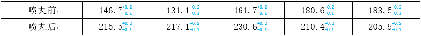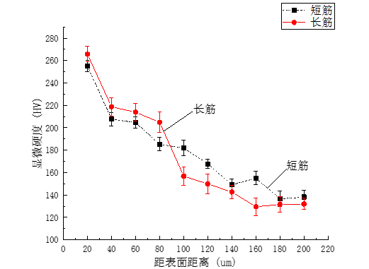 表3:噴丸前后試樣顯微硬度(HV) 隨后對噴丸處理的鑄件加強筋處取樣斷面進行顯微硬度測量,結果見圖2。結果表明,隨著從材料表層到心部硬度有逐漸下降的趨勢,推測這是由于噴丸處理而形成的強化層具有一定厚度(約幾十微米數量級),且隨著距表面距離的增加,噴丸強化效果逐漸減弱,直至消失。