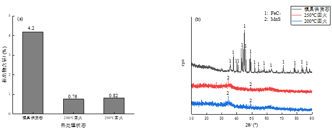 圖9:不同狀態(tài)下實(shí)驗(yàn)鋼析出物含量和XRD分析 由此可見,模具供貨態(tài)實(shí)驗(yàn)鋼的析出物為滲碳體,這和在掃描電鏡下觀察到的析出物即滲碳體顆粒,而模具供貨態(tài)實(shí)驗(yàn)鋼組織正是由片狀珠光體組織和網(wǎng)狀鐵素體組成,其中珠光體正是由α相和滲碳體組成的機(jī)械混合物,故其XRD分析結(jié)果中析出物為滲碳體,而滲碳體的存在會在一定程度上提高材料的耐磨性,但由于其基體組織為網(wǎng)狀鐵素體和片狀珠光體組織,故耐磨性仍較低。 經(jīng)過200 ℃和250 ℃回火后,XRD分析顯示無較明顯的衍射峰,由圖9b可以看出有極少量MnS析出,屬于鋼中最常見的非金屬塑性夾雜物之一,除此之外,并未觀察到碳化物析出,但是考慮到其基體組織為回火馬氏體和少量殘留奧氏體,與模具供貨態(tài)相比有本質(zhì)上的區(qū)別,正是由于基體組織的明顯改善反映出淬火回火后實(shí)驗(yàn)鋼耐磨性得到顯著提高。 3、結(jié)論 (1) 經(jīng)過淬火回火后實(shí)驗(yàn)鋼由模具供貨態(tài)的片狀珠光體和網(wǎng)狀鐵素體組織轉(zhuǎn)變?yōu)榛鼗瘃R氏體和少量殘留奧氏體組織,力學(xué)性能大幅度改善。經(jīng)過淬火+200 ℃回火后實(shí)驗(yàn)鋼抗拉強(qiáng)度和硬度分別達(dá)到最大值1287.8 MPa和480.1HBW。且隨著回火溫度達(dá)到250℃,抗拉強(qiáng)度和硬度降低。 (2) 模具供貨態(tài)實(shí)驗(yàn)鋼含有最高含量析出物FeC3,而經(jīng)淬火回火后實(shí)驗(yàn)鋼析出物含量極少,僅發(fā)現(xiàn)有少量MnS非金屬夾雜物存在。 (3) 模具供貨態(tài)實(shí)驗(yàn)鋼磨損率和摩擦因數(shù)最高,淬火+200 ℃回火后磨損率和摩擦因數(shù)最低分別為0.27%和0.38,250 ℃回火次之。綜合考慮不同狀態(tài)下實(shí)驗(yàn)鋼耐磨性的測試結(jié)果,確定經(jīng)過淬火+200 ℃回火后的實(shí)驗(yàn)鋼耐磨性最佳,250 ℃回火次之,均優(yōu)于模具供貨態(tài)的耐磨性。