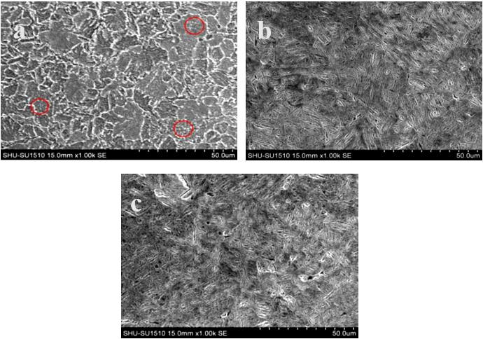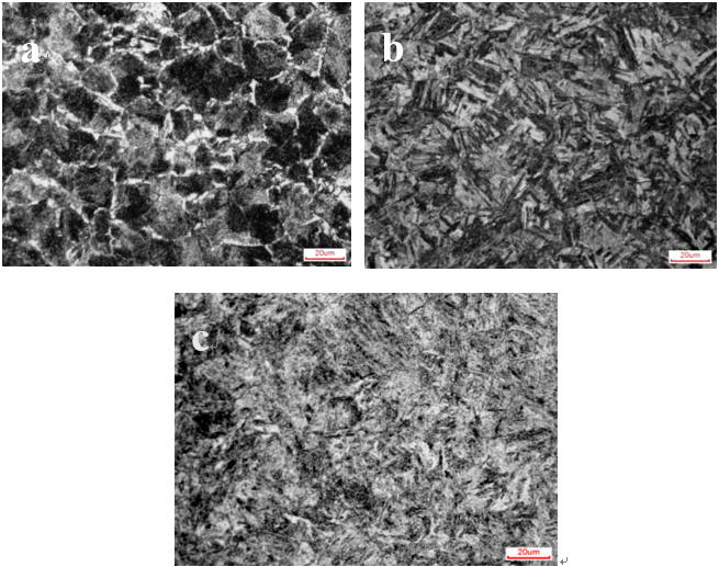 圖2:拉伸樣尺寸示意圖 2、試驗(yàn)結(jié)果與分析 2.1 顯微組織 圖3為不同狀態(tài)下實(shí)驗(yàn)鋼顯微組織,從圖3a可以看出,模具供貨態(tài)下的實(shí)驗(yàn)鋼室溫組織為白色呈網(wǎng)狀分布的鐵素體和片狀珠光體組成,網(wǎng)狀鐵素體沿晶界分布在片狀珠光體之間,對組織之間的連續(xù)性造成破壞,從而使基體結(jié)構(gòu)受到損壞,材料本身的硬度,抗拉強(qiáng)度和耐磨性等性能均會受到明顯不利影響,在材料受到外力擠壓出現(xiàn)微小裂紋時,其裂紋會沿著呈網(wǎng)狀形態(tài)的鐵素體迅速進(jìn)行延伸和擴(kuò)展,使得工件更易損傷和斷裂。有研究指出,在冷卻過程中多余的鐵元素在過冷奧氏體中會由晶粒內(nèi)部向晶粒外部進(jìn)行析出,以達(dá)到維持其自身的相平衡和穩(wěn)定性的目的,從而形成了先共析鐵素體相,由于這種向晶粒外部四周析出的過程并無方向性,則這些鐵元素會逐漸富集到將其析出的晶粒的晶界上,從而會沿著四周把整個奧氏體晶粒“包”起來,故從微觀上呈現(xiàn)出網(wǎng)狀鐵素體的組織形態(tài)。此外,除了觀察到網(wǎng)狀鐵素體組織之外,還發(fā)現(xiàn)了魏氏組織的存在。魏氏組織的形成主要是由于亞共析鋼或者過共析鋼在較高的溫度進(jìn)行冷卻時,在奧氏體晶界上產(chǎn)生先共析鐵素體并且沿著一定的晶面朝著晶內(nèi)進(jìn)行快速生長,且呈針狀分布在基體組織中,這種組織屬于加工處理時產(chǎn)生的缺陷之一,而魏氏組織的出現(xiàn)則會使得材料強(qiáng)度硬度變低,塑韌性降低,影響材料的使用壽命。